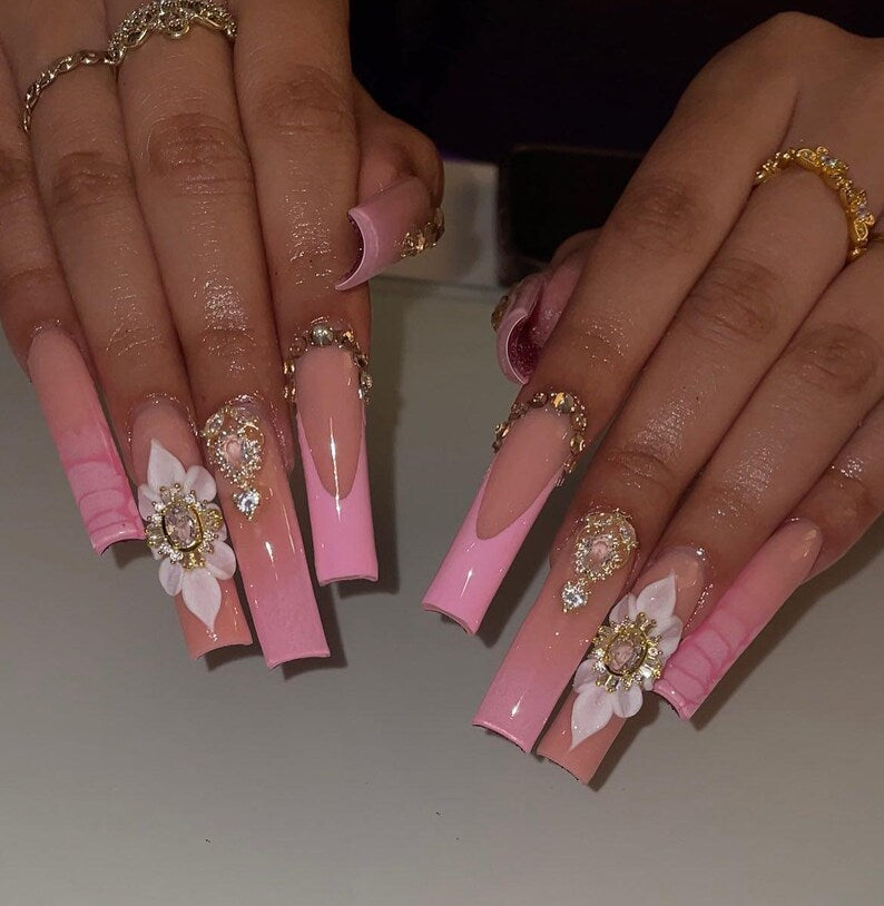 3D Flower FreeStyle Medium Almond Press On Nails | Pink ombre nail | French nail
