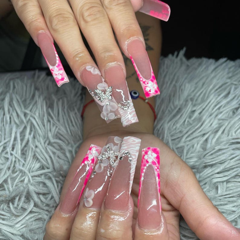 3D Butterfly and Flower Pink White French Tip XL Square Press On Nails | Rhinestone Glam Gyaru | Acrylic & Press On Nails Dreamy Pink Flower