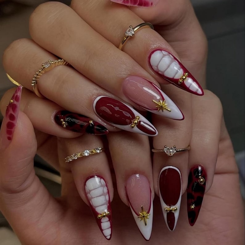 Gold Cross Gothic Long Stiletto Nails | Gothic Gold & Deep Burgundy Nail Art | Handmade Stiletto Nails | Elegant Fake Nails