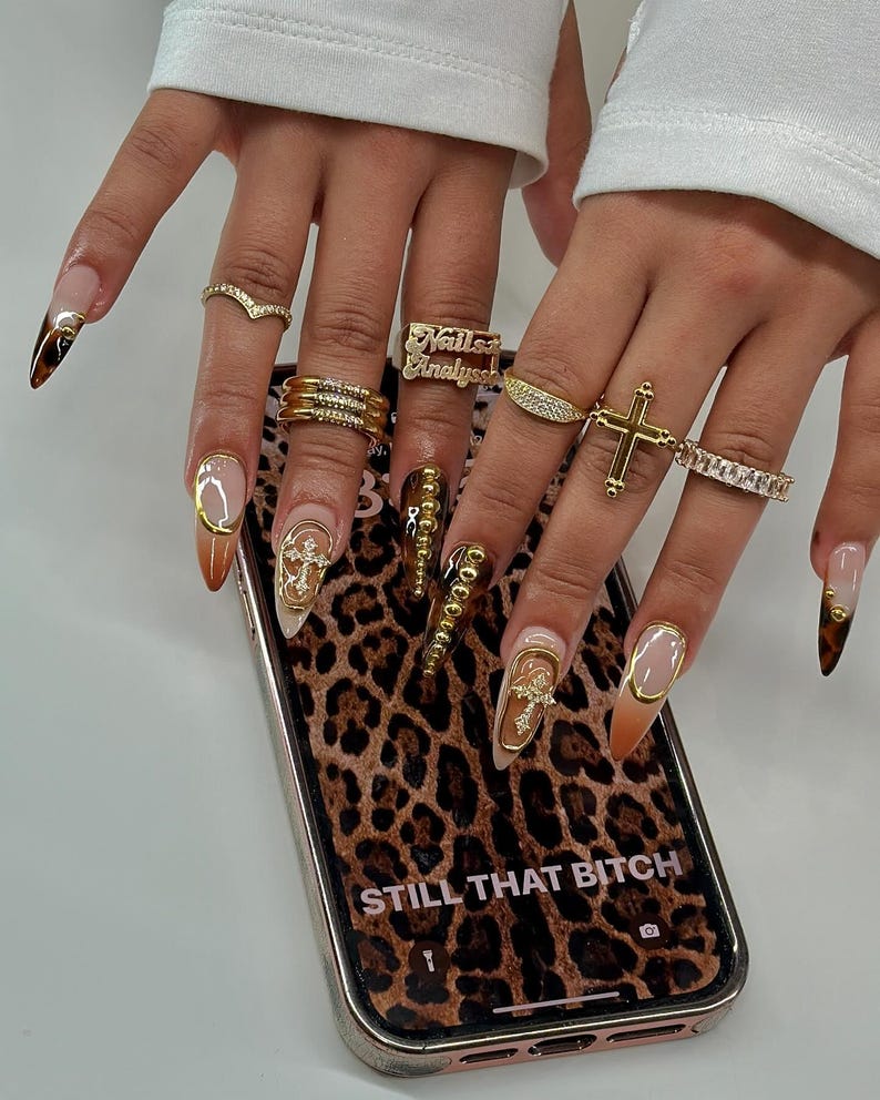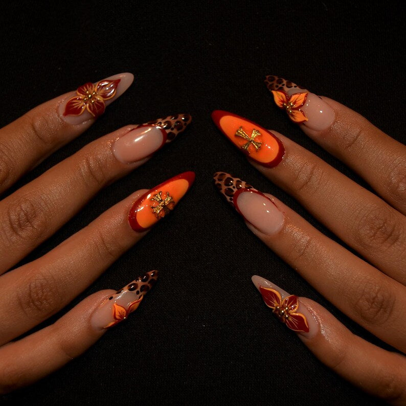 Elegant French Tip Press On Nails | Long Almond Leopard Nails | Orange Orchid & Cross Nail Art | Luxury Chic Press Ons