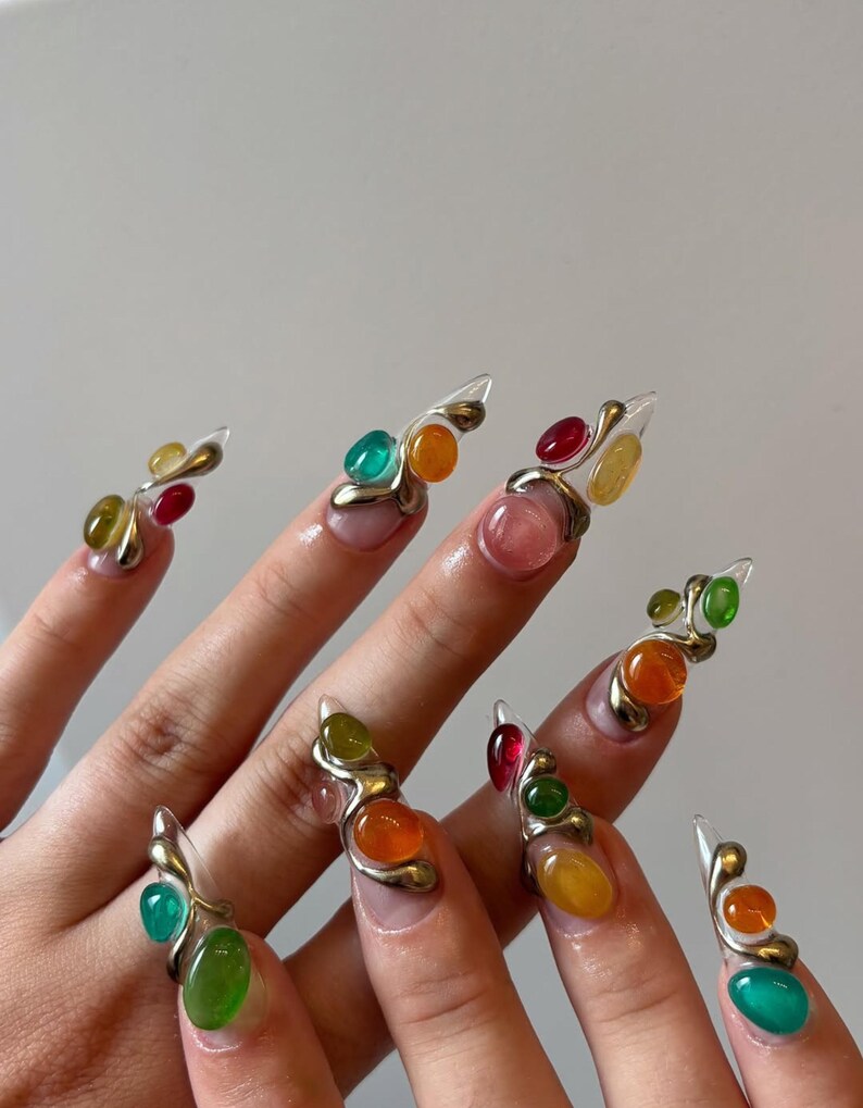 Gemstone Fantasy Press On Nails | Sculptural Jelly Chrome Nail Set | 3D Mineral Stone Nail Art | Futuristic Rainbow Nails