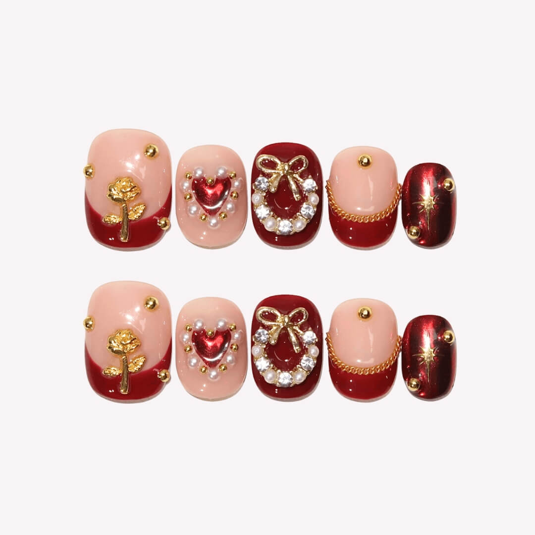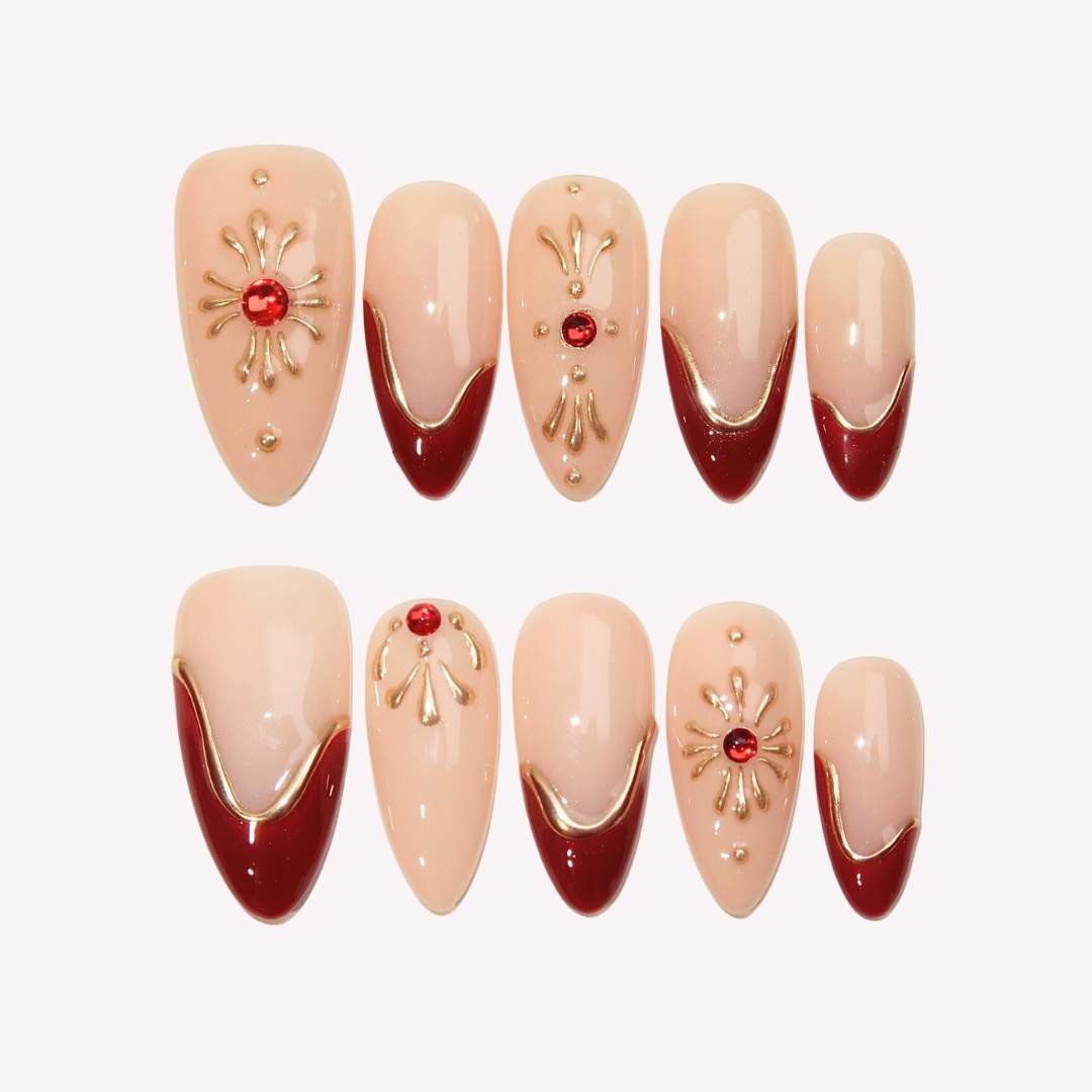 Indulge in luxury with Regal Ruby. This lavish press-on set combines red, nude, and gold...
