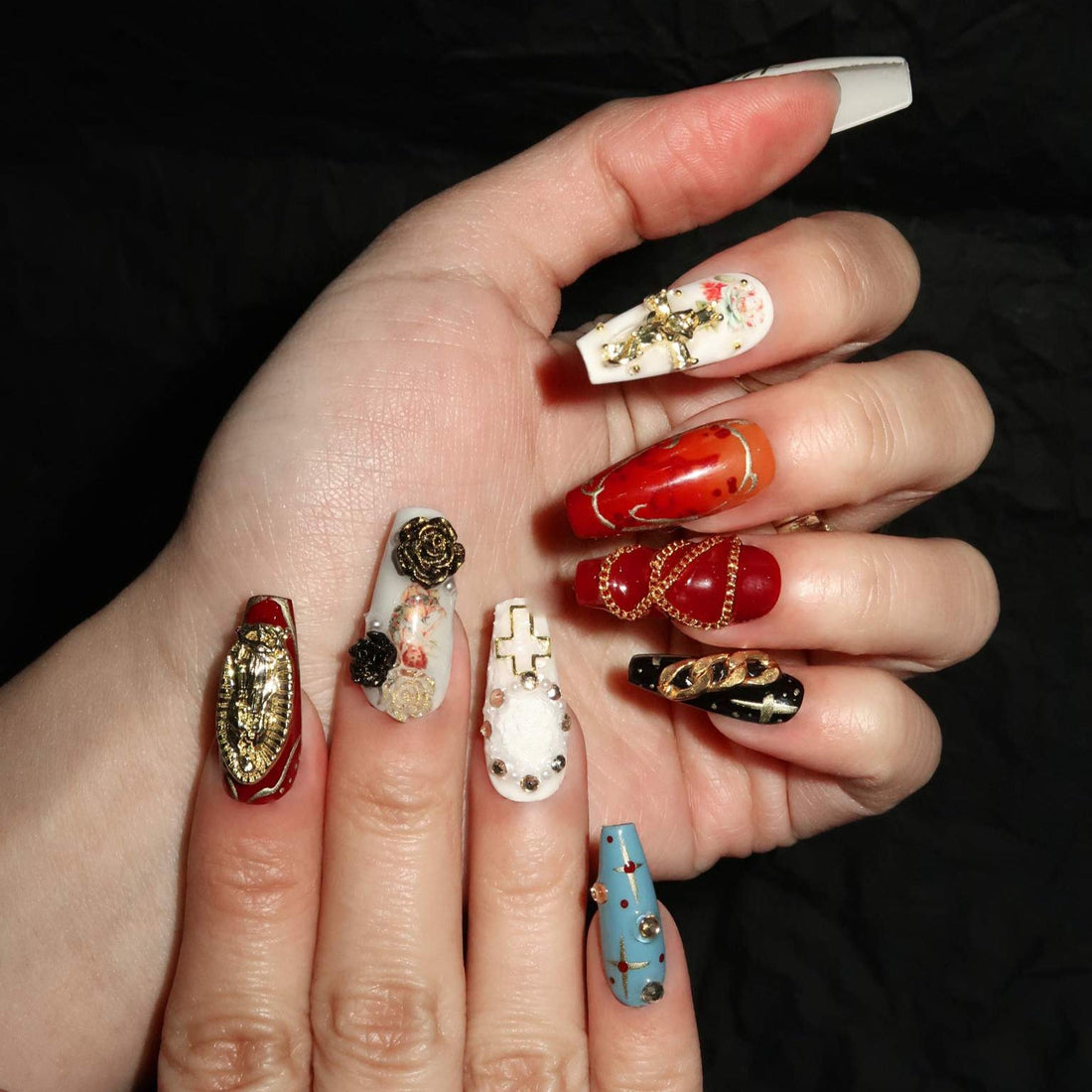 The Sacred Icon press-on nails set invites you to adorn your hands with designs that...