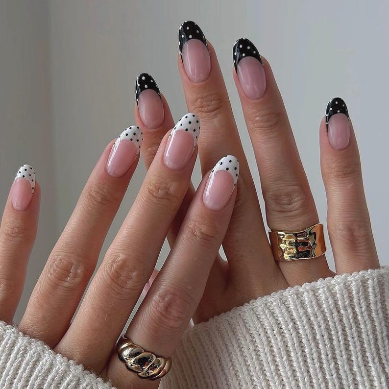 Black & White Polka Dot French Tip Press-On Nails – Classy Minimalist Almond Nail Set, Handmade Reusable Nail Art