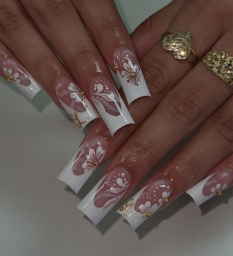 Elegant Blossom French Press On Nails | White & Pink Floral Nail Art | Long Square Handmade Luxury Set | Delicate 3D Flower Nails