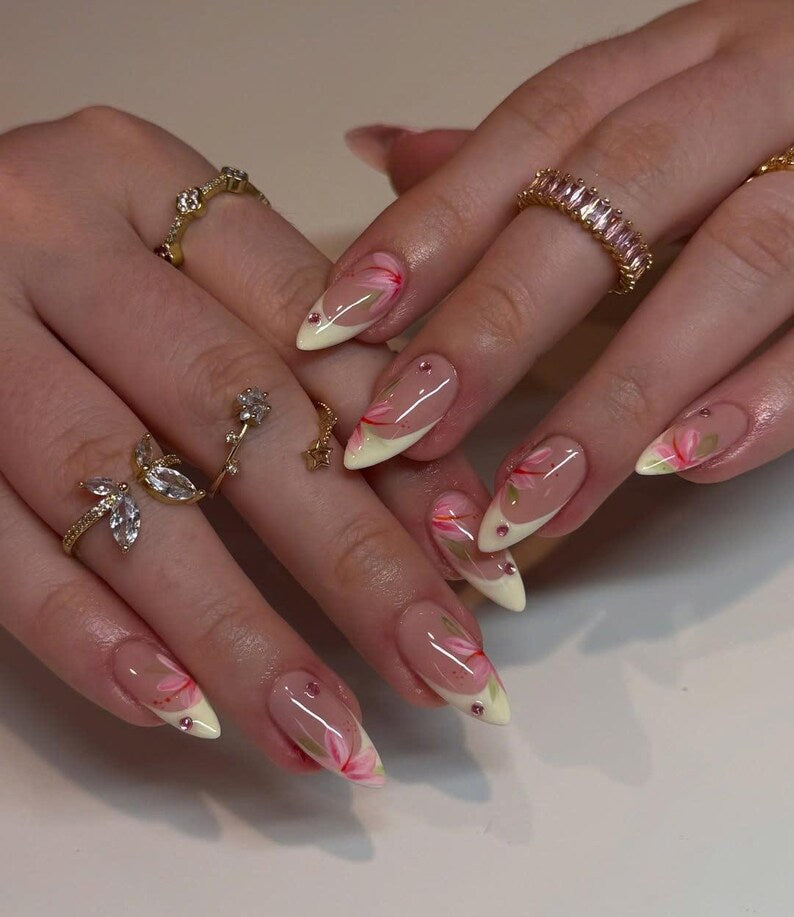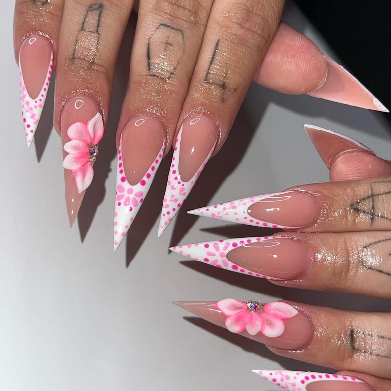 French Tip Press On Nails | 3D Floral Almond Nail Set | Floral Press On Nails Stilleto Irregular French Tips Spring Trendy Nail