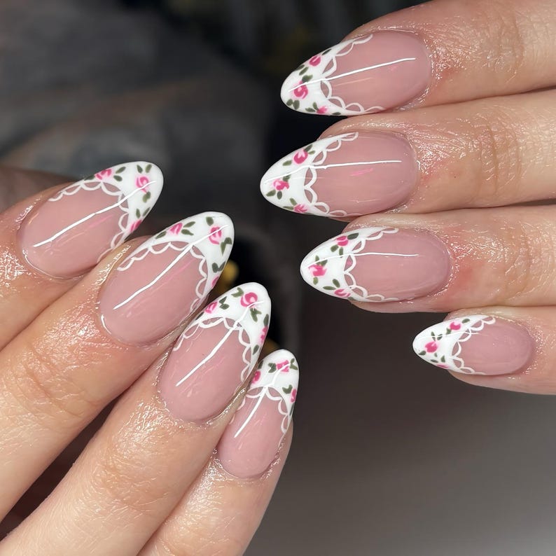 Floral Lace French Press On Nails, Soft Pink Romantic Nails with Hand Painted Rose Tips, Elegant Coquette Nail Set, Pink French Tips Nails