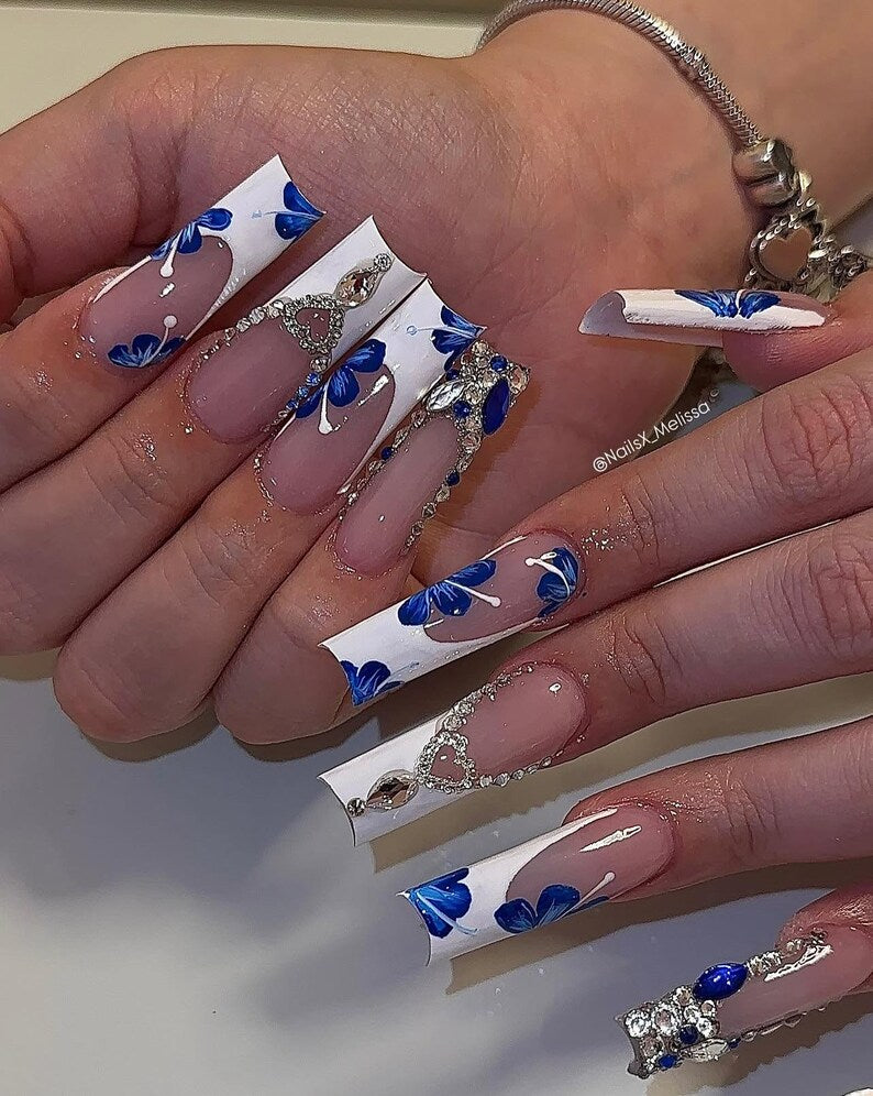 Glams Blue Press On Nails Long Square Nails | Blue Flower nails | Floral Nails | Elegant French Tip Nails | Daily Nails | Spring Nails