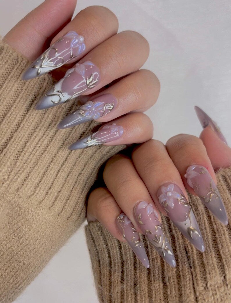 Spring Floral Elegant Press On Nails | Lavender Smoke French Tips Nail Art | 3D Floral Pearl Nails | Elegant Silver Filigree Design