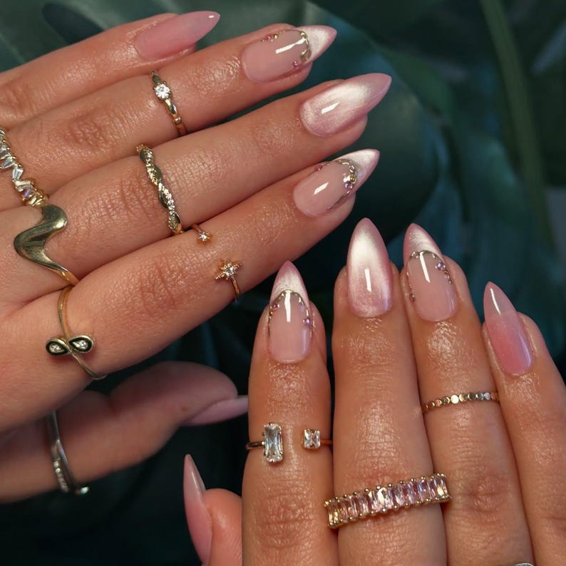 Galaxy Pink Blush Glittery French Cat eye Nails | Reusable Press on Nails | Fairy Almond nails | Minimalist Style Nails | French Tip Nails