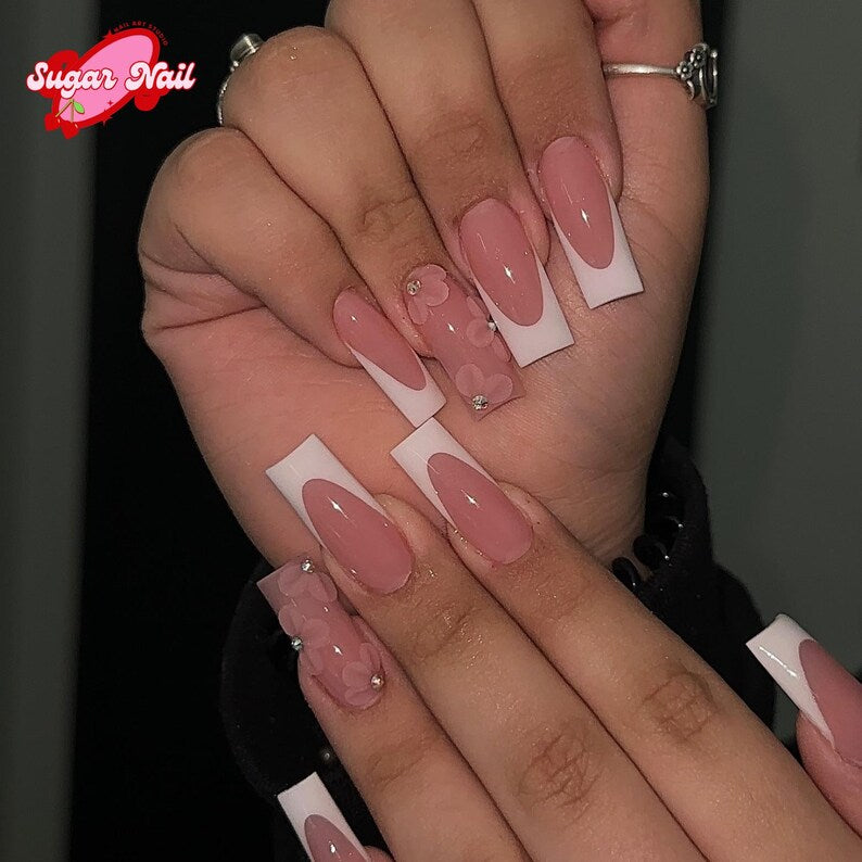 French – Press-On Nails with Neutral Pink Base, White French Tips & Floral Accents | Handmade Fake Nails Glue-On Nail Extensions
