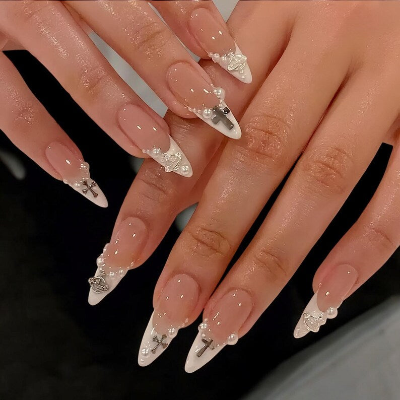 Handmade Pearl Cross Press On Nails: Edgy French Tip Nail Art