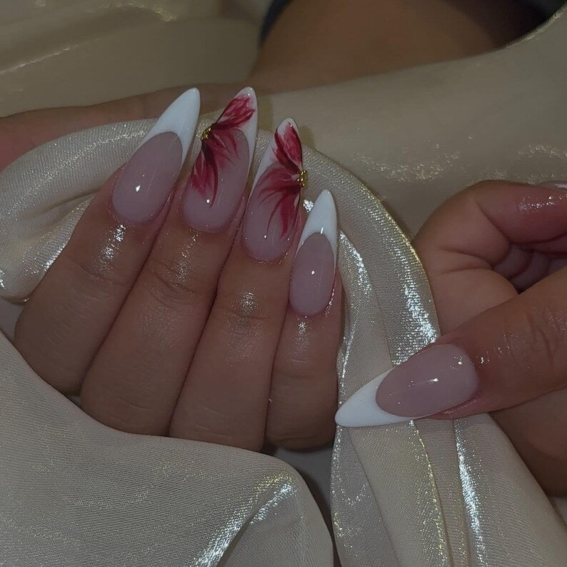 Hand Painted Floral French Press On Nails | Red Flower French Tip Nails | Acrylic Stiletto Fake Nails | Elegant Nail Art Wedding Nails