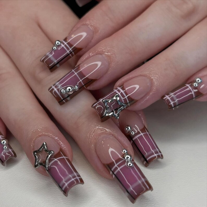 Y2K Star Press On Nails, Pink Plaid French Tip, Glossy Square Nails, Trendy 2000s Aesthetic, Pink Plaid French Tips with Silver Star charms
