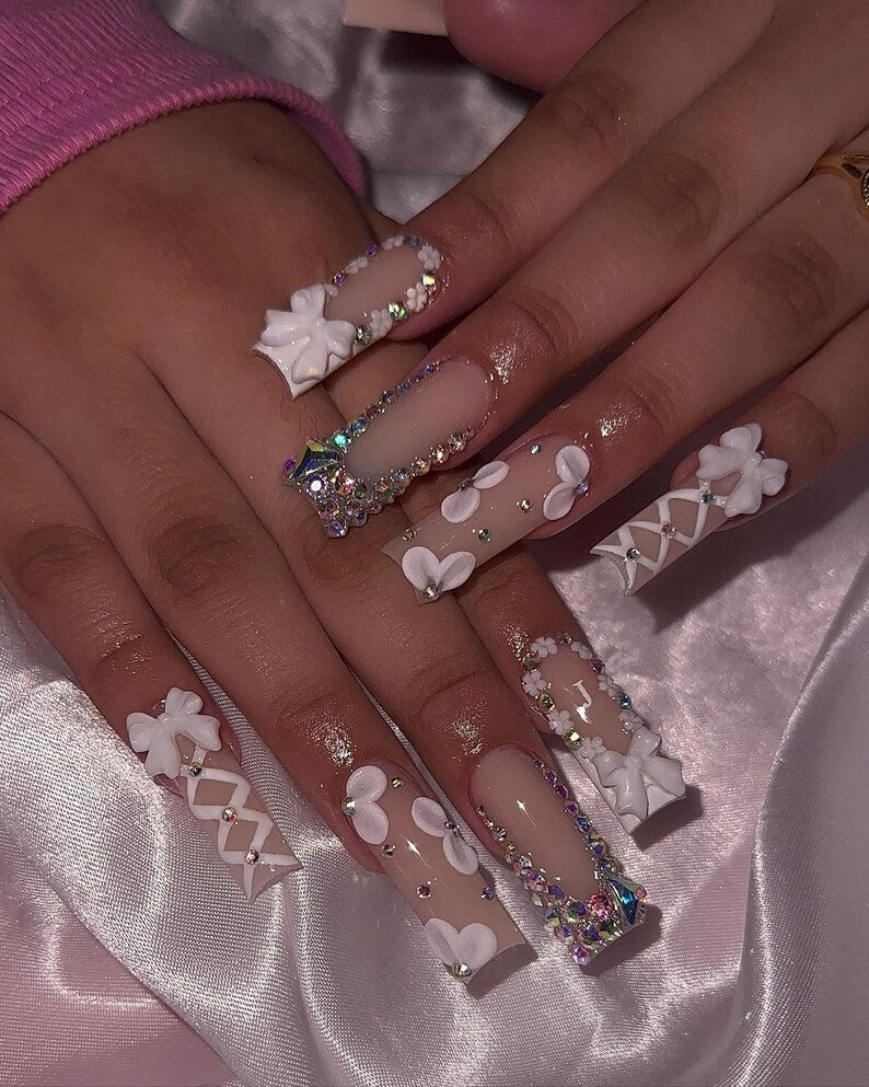 Classy Press On Nails | Long Square French Tip Nails | Floral Bow Rhinestone Design | Elegant French Tip Press On Nails