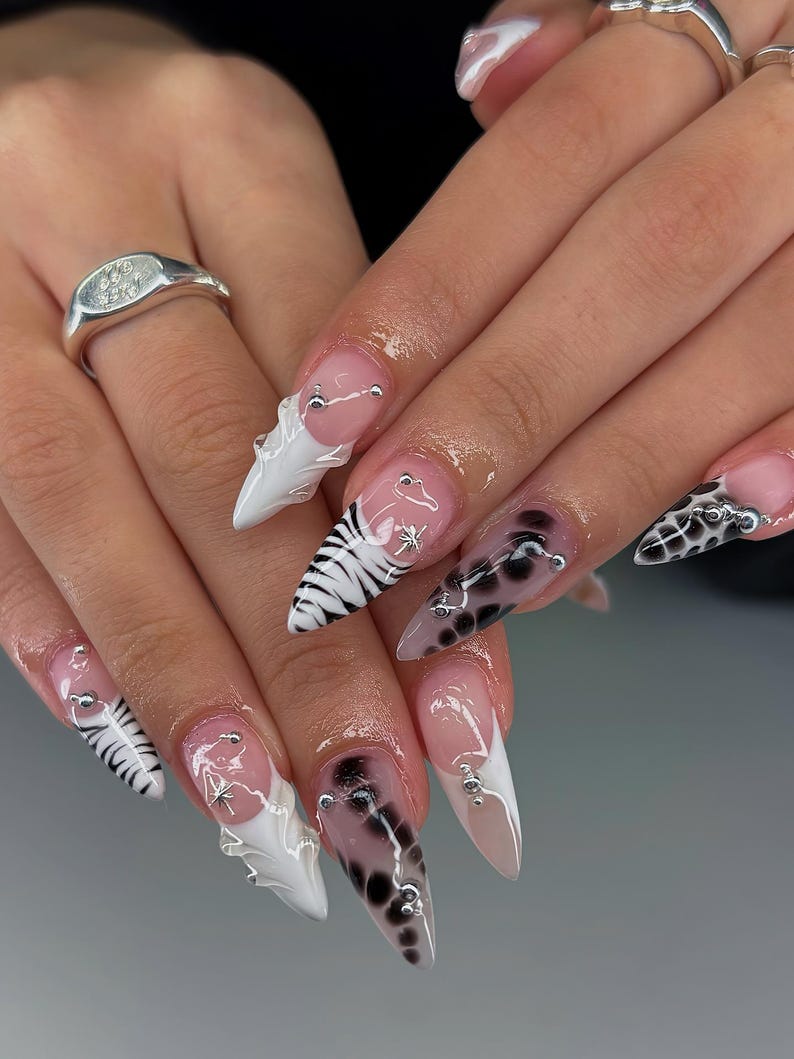 Y2K Mixed Print Press On Nails, Black White French Tip, Zebra Cow Print Nails, Black White Y2K Nails