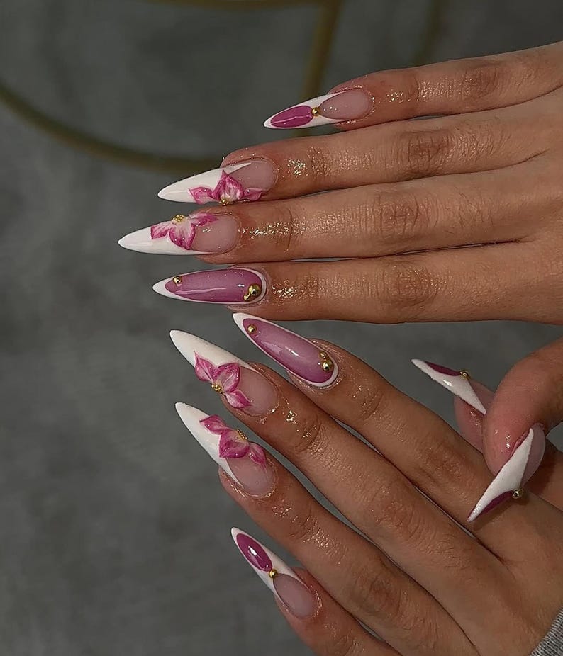 Elegant Orchid Bloom Press On Nails | White French Stiletto Nails | 3D Floral Accent| Elegant Pink & White Nail Art | Handmade Nail
