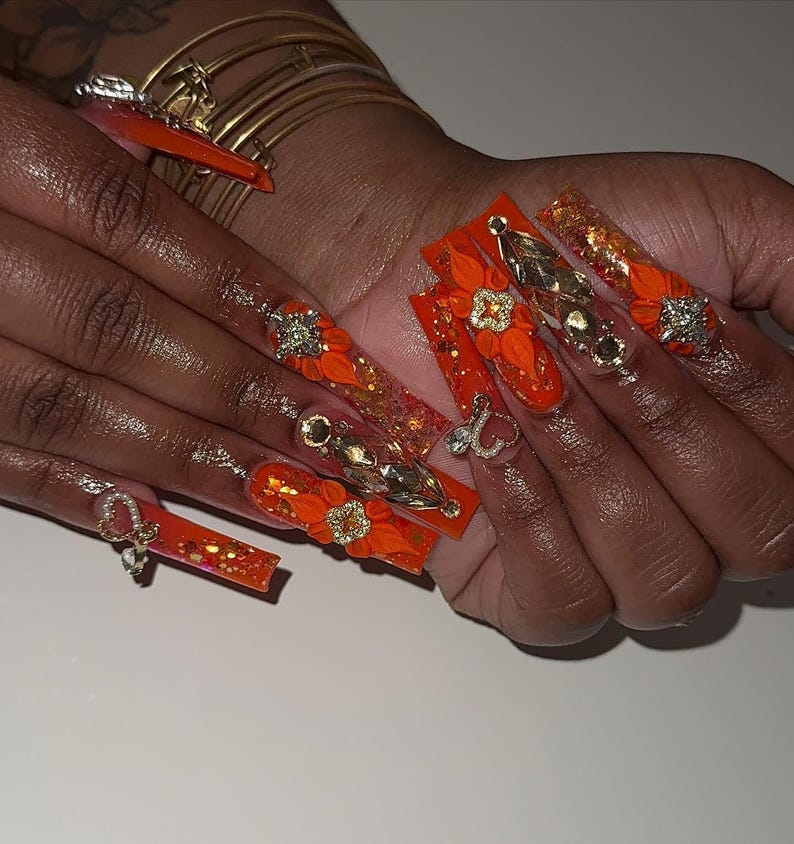 press on nails, orange nails, 3d flower nails, luxury nails, bling fake nails, heart charm...