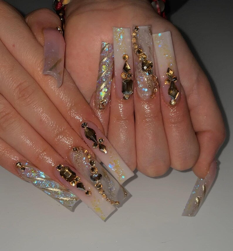 press on nails, luxury nails, 3d flower nails, gold press ons, xl square nails, maximalist...