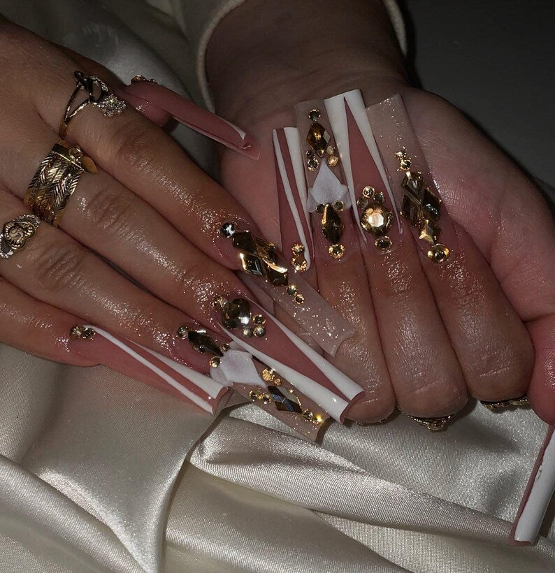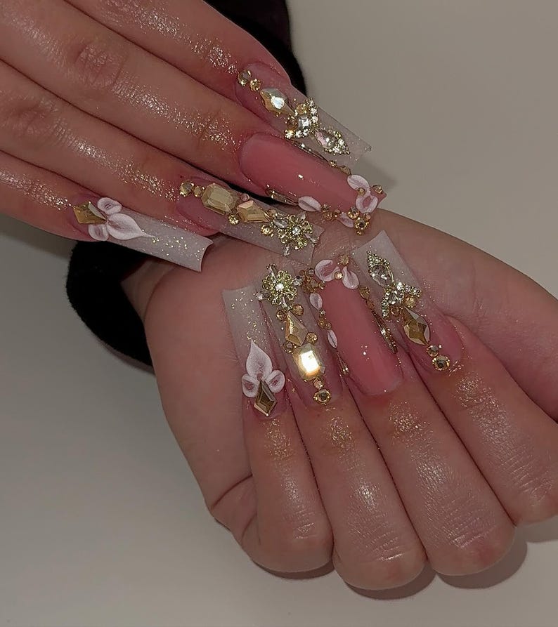 Hand-Painted 3D Flower Luxury Pink and White XL Square Press On Nails | Gold Crystal Bling Bridal Nails | Handmade Prom & Wedding Nail Art