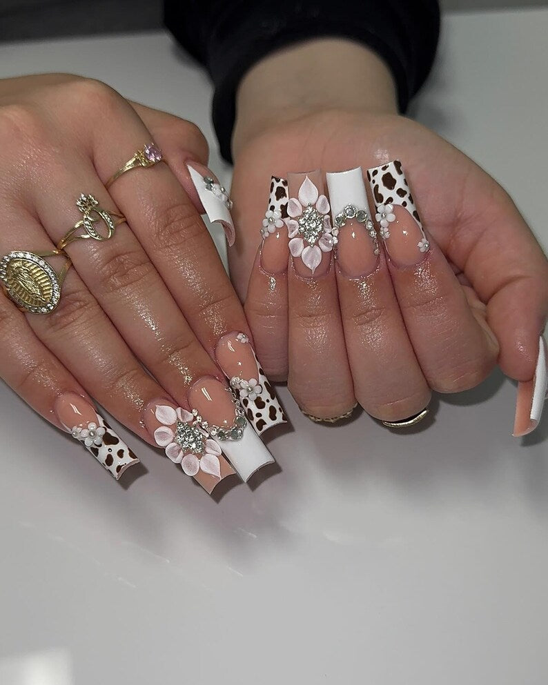 press on nails, fake nails, cow print nails, 3d flower nails, luxury press ons, xl...