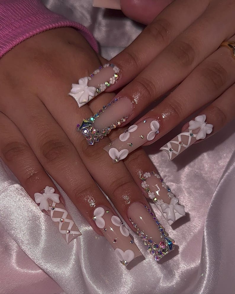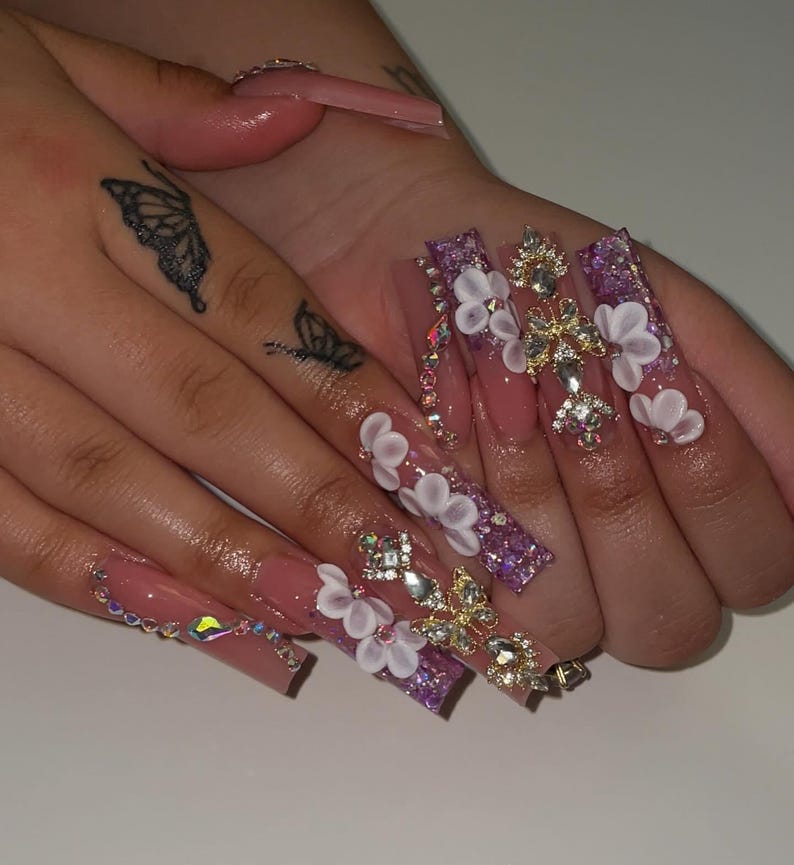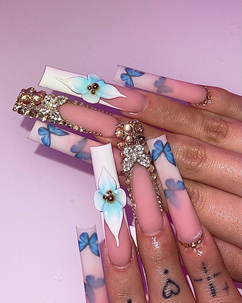 press on nails, fake nails, 3d flower nails, luxury nails, handmade nails, long square nails,...