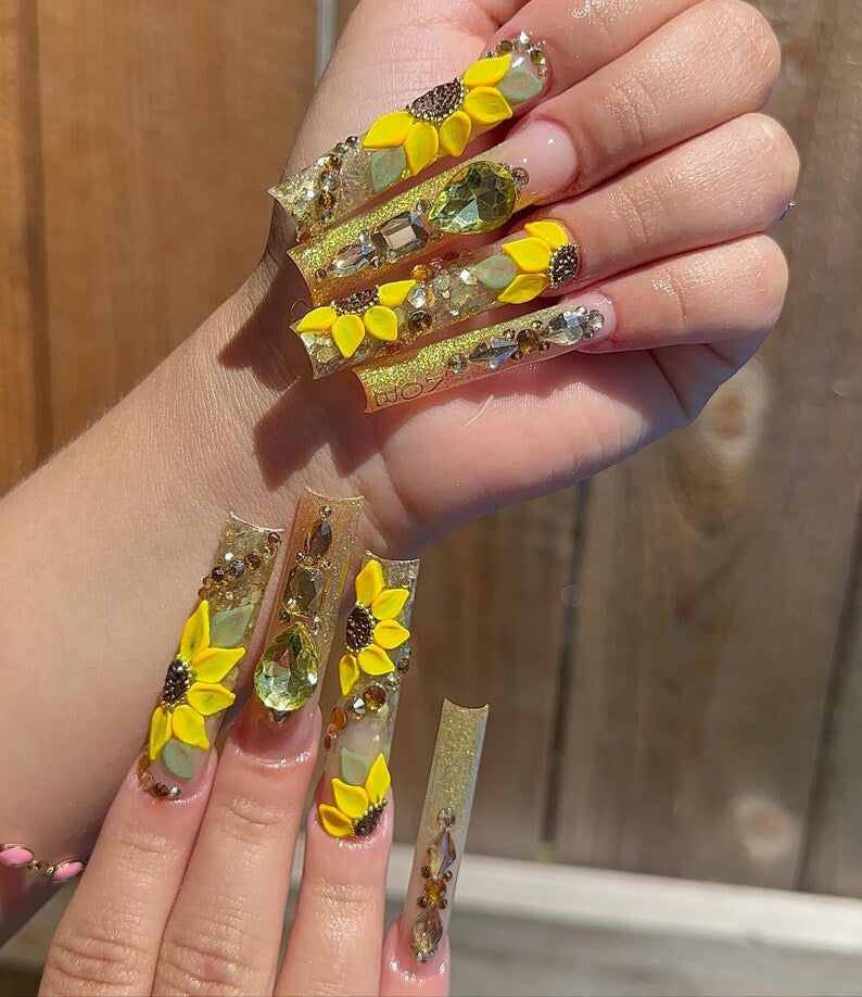 Sunflower Press On Nails: 3D Floral Nail Art | Luxury Gold Press On Nails | XL Square Sparkly Nails | Glam Sunflower Rhinestone Nail Art