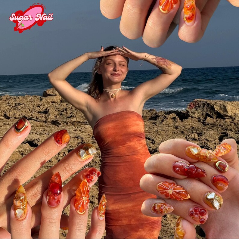 Orange Lily – Bright floral-inspired press on nails with vivid orange tones. Elegant, long-lasting design...