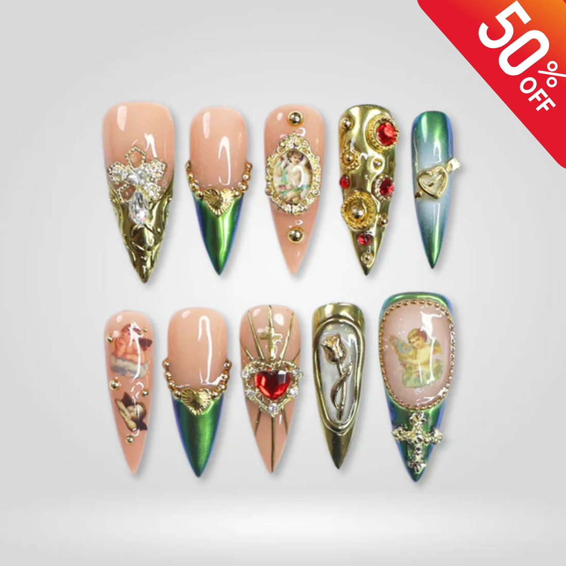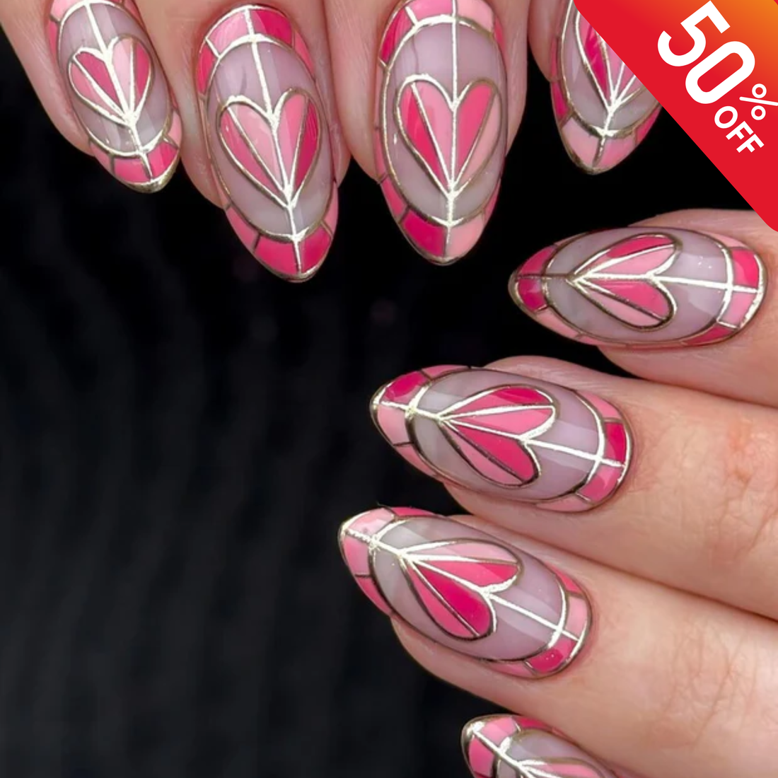 Pink Gold Heart Press On Nails inspired by stained glass artistry feature delicate heart details,...