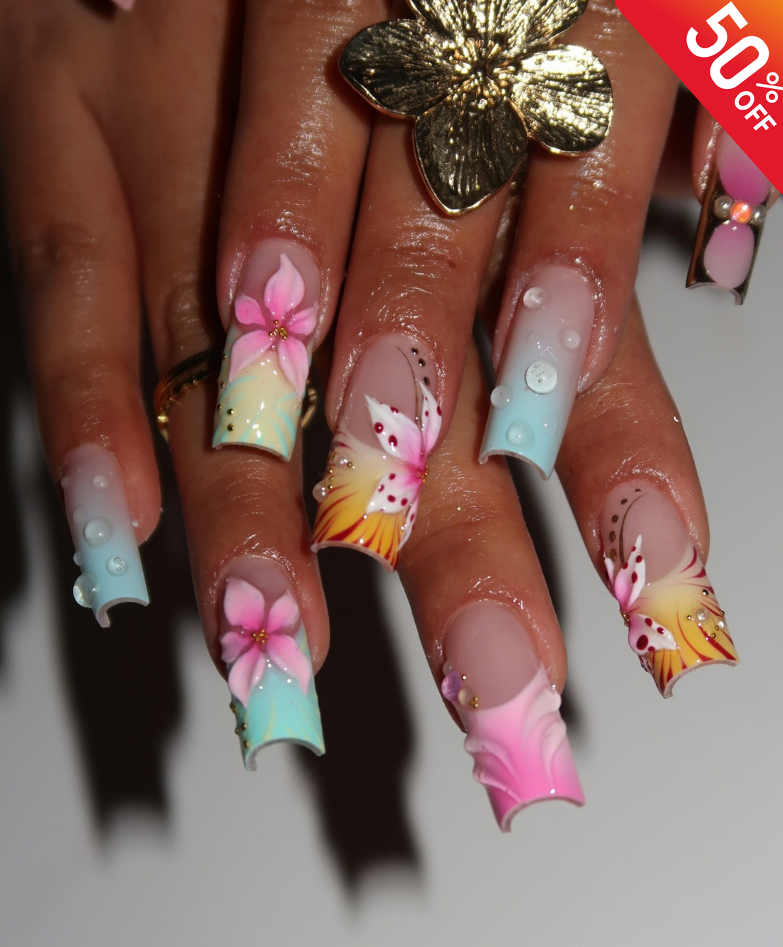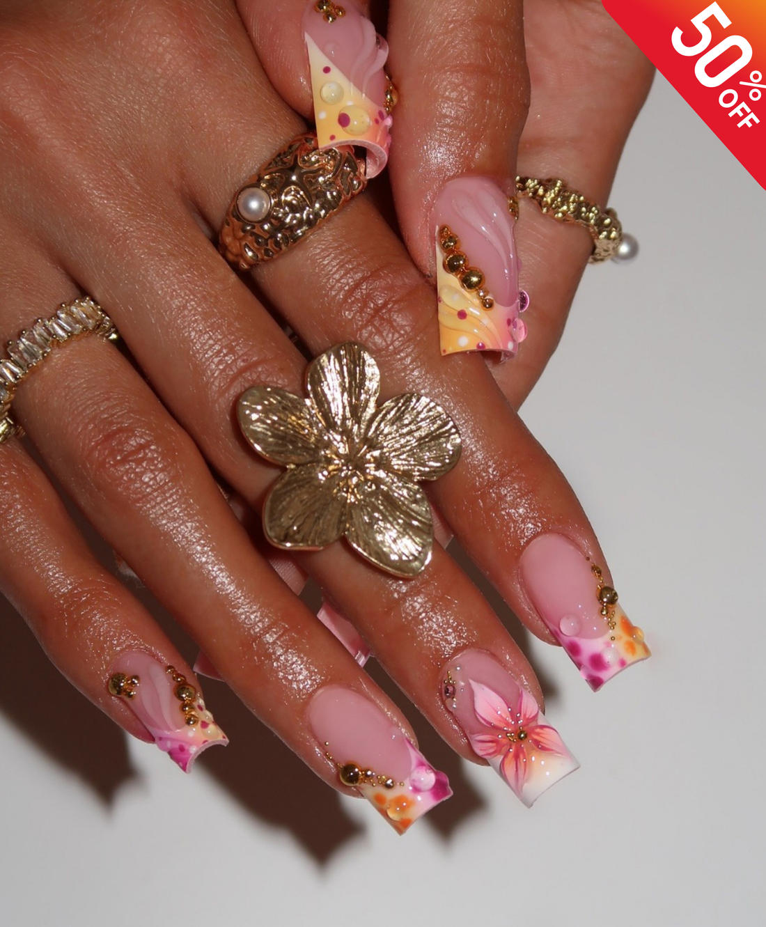 Handmade 3D Pink Tropical Flower Press On Nails | Sculpted Shell & Water Droplet Luxury Fake Nails | Long Square Sunset Nails for Summer Vacation