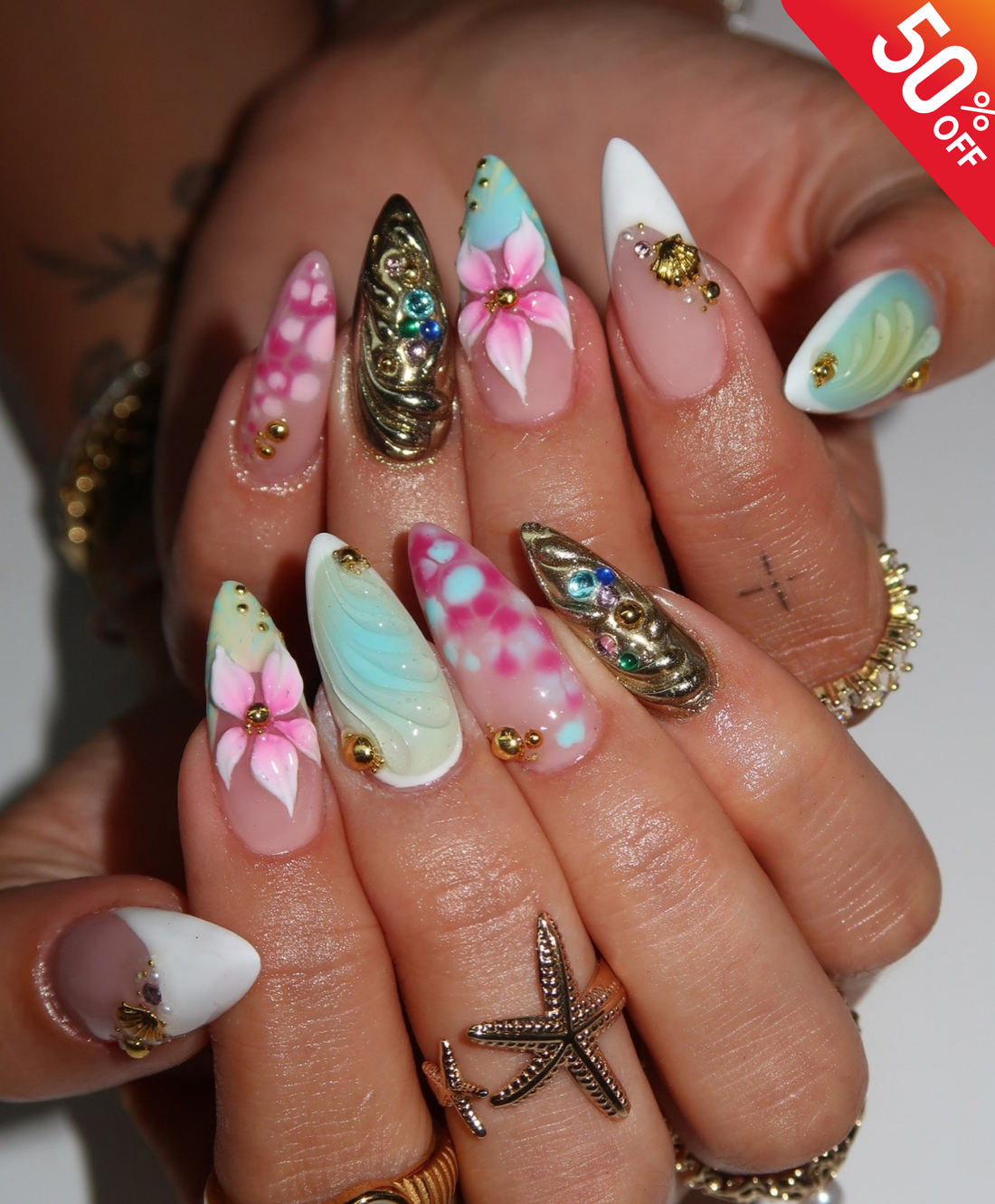 Handmade 3D Liquid Gold & Mermaid Shell Press On Nails | Sculpted Pink Flower Luxury Fake Nails | Long Stiletto Avant-Garde Nails for Festival