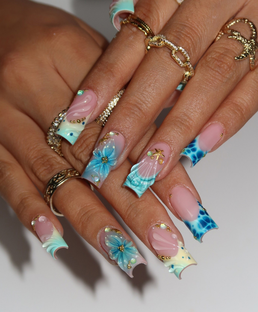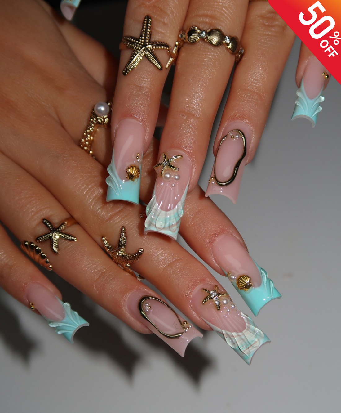 Handmade 3D Tiffany Blue Mermaid Press On Nails | Liquid Gold Frame & Starfish Luxury Fake Nails | Long Square Beach Nails for Summer Cruise