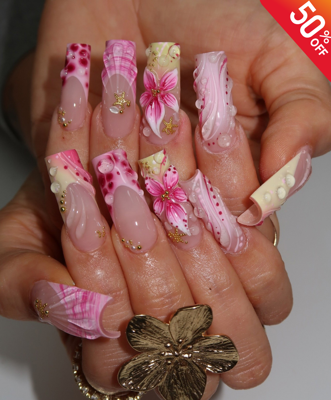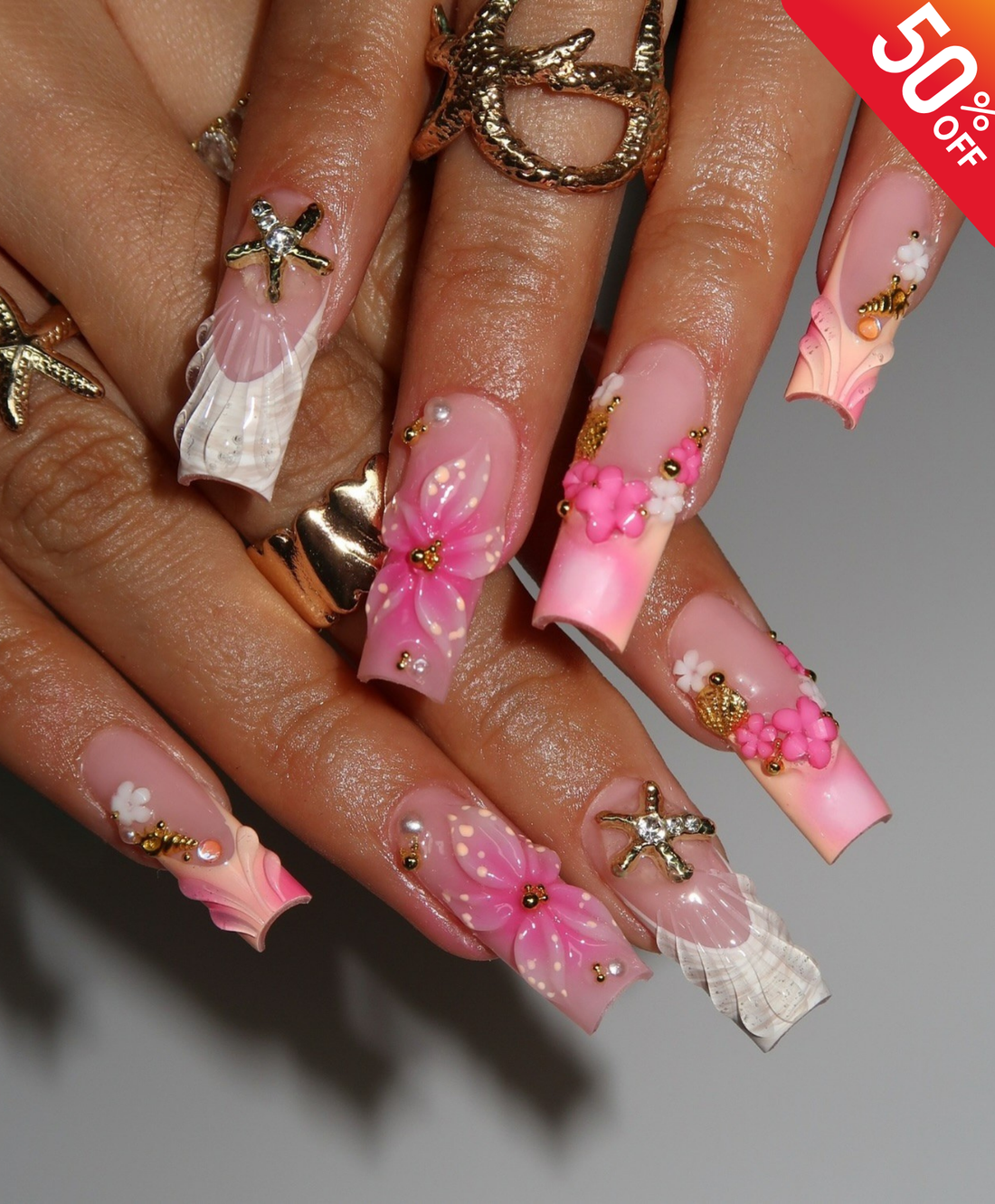Handmade 3D Pink Tropical Flower Press On Nails | Sculpted Shell & Starfish Luxury Fake Nails | Long Square Mermaid Nails for Summer Vacation