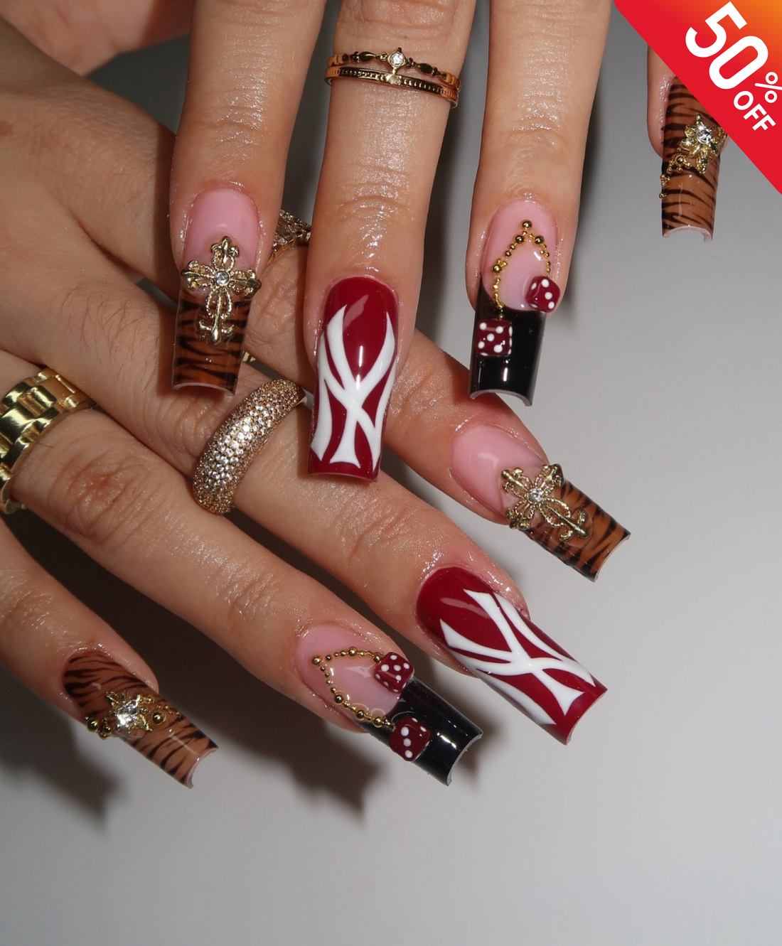 Handmade Y2K NY Logo & Tiger Print Press On Nails | Red Dice & Gold Cross Luxury Fake Nails | Long Square Streetwear Baddie Nails for Party
