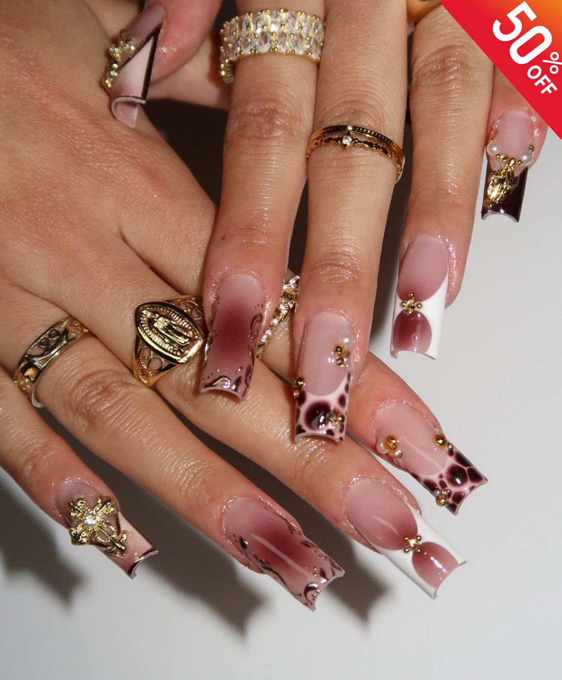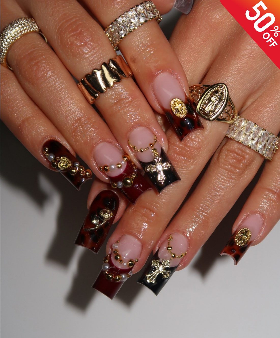 Hand-Painted Luxury Tortoiseshell & Burgundy 3D Cross Press On Nails | Gothic Baroque Gold Rose Long Square Nails | Fall Winter Nail Art