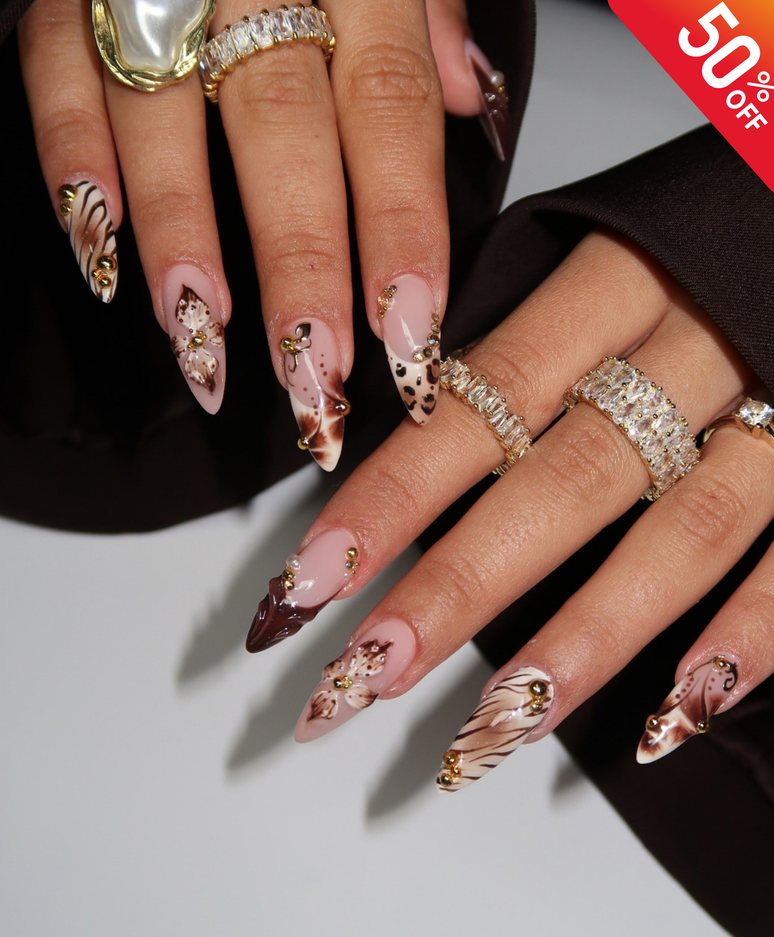 Handmade 3D Brown Floral & Animal Print Press On Nails | Sculpted Leopard Flower Luxury Fake Nails | Long Almond Fall Nails for Coffee Date