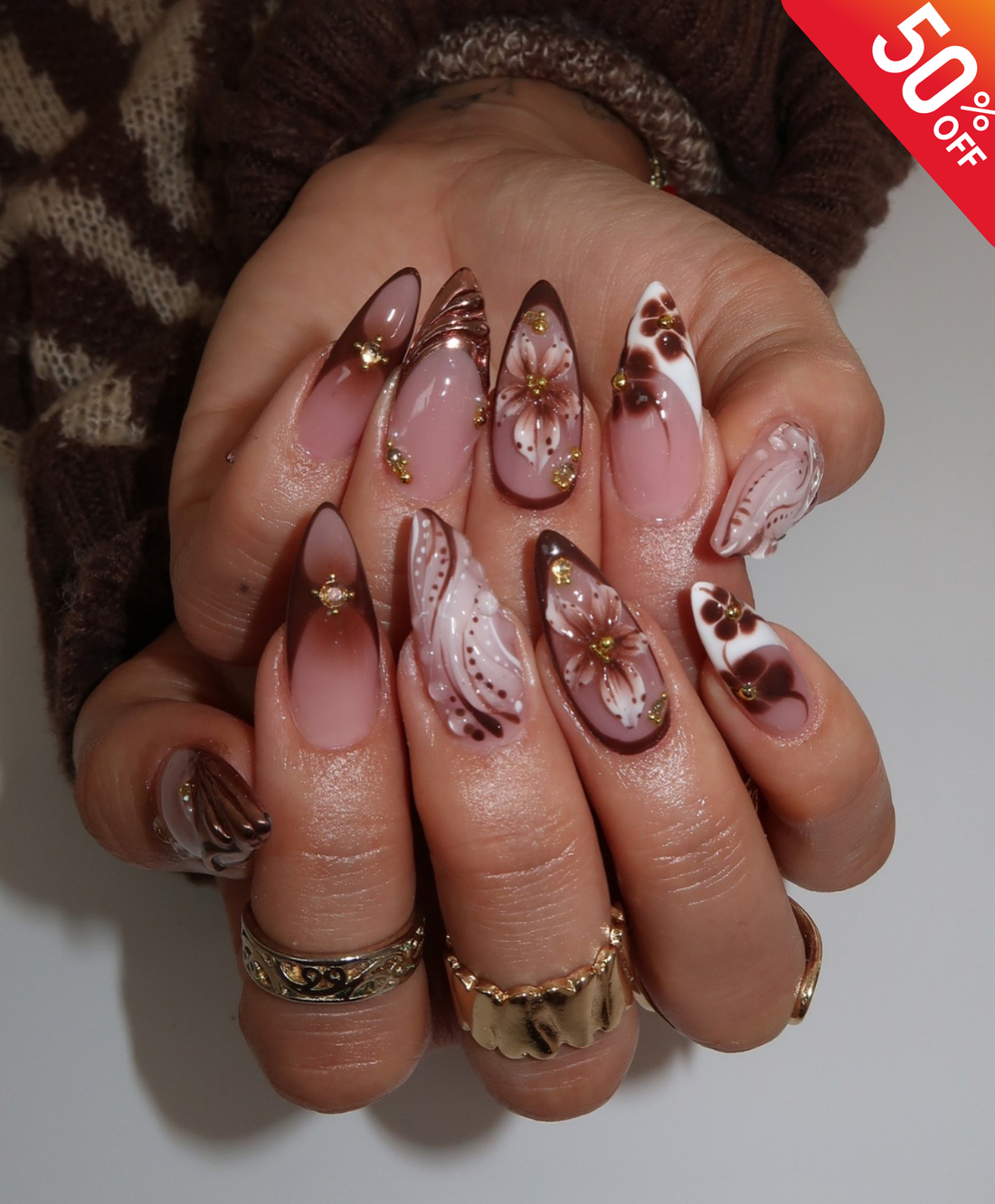 Handmade 3D Brown Floral & Shell Press On Nails | Chocolate Ombre Flower Luxury Fake Nails | Long Almond Autumn Nails for Coffee Date & Event
