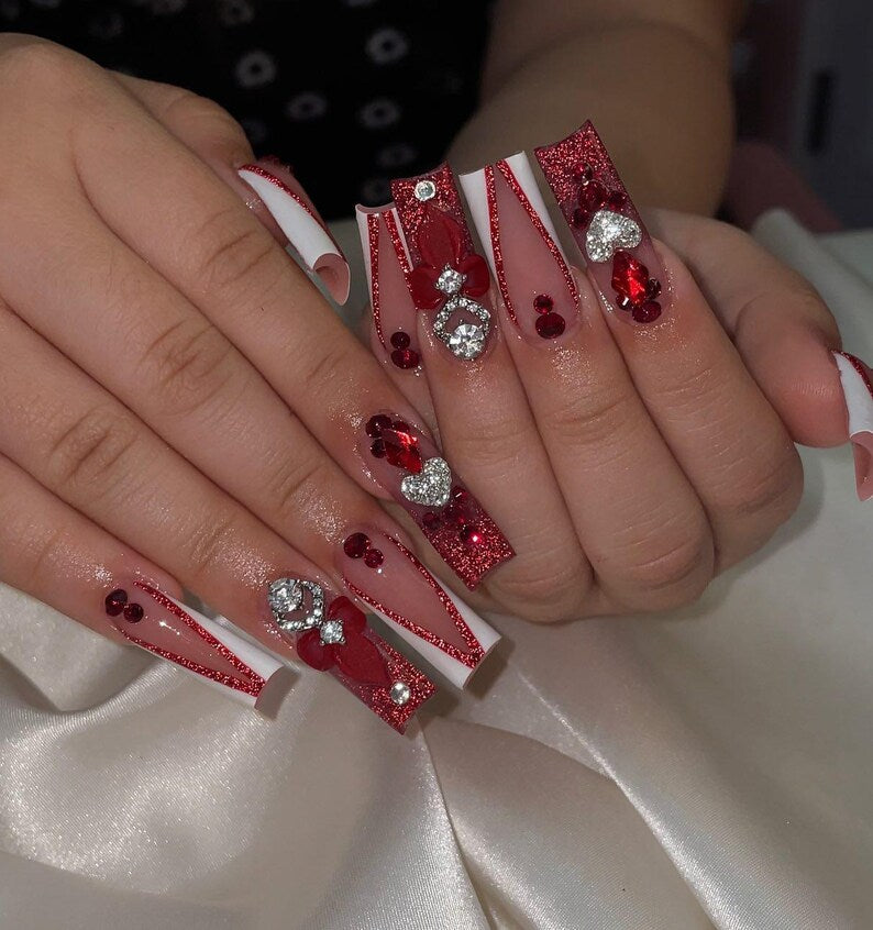 red french tip nails, heart charm nails, valentine press ons, glitter press on nails, romantic...