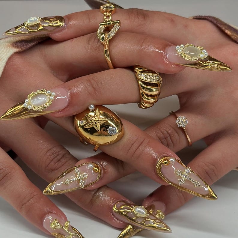 Freestyle Luxury Baroque Gold 3D Press On Nails with Cross Pearl Gem Design, Long Almond Handmade Gothic Nail Art Set For Party, Birthday