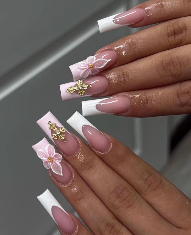 3D Floral Press On Nails feature crisp white French tips accented with sculpted 3D floral details and striking cross charm designs for a refined yet bold look. Designed in a long square shape, this handmade nail set blends classic elegance with modern statement elements.