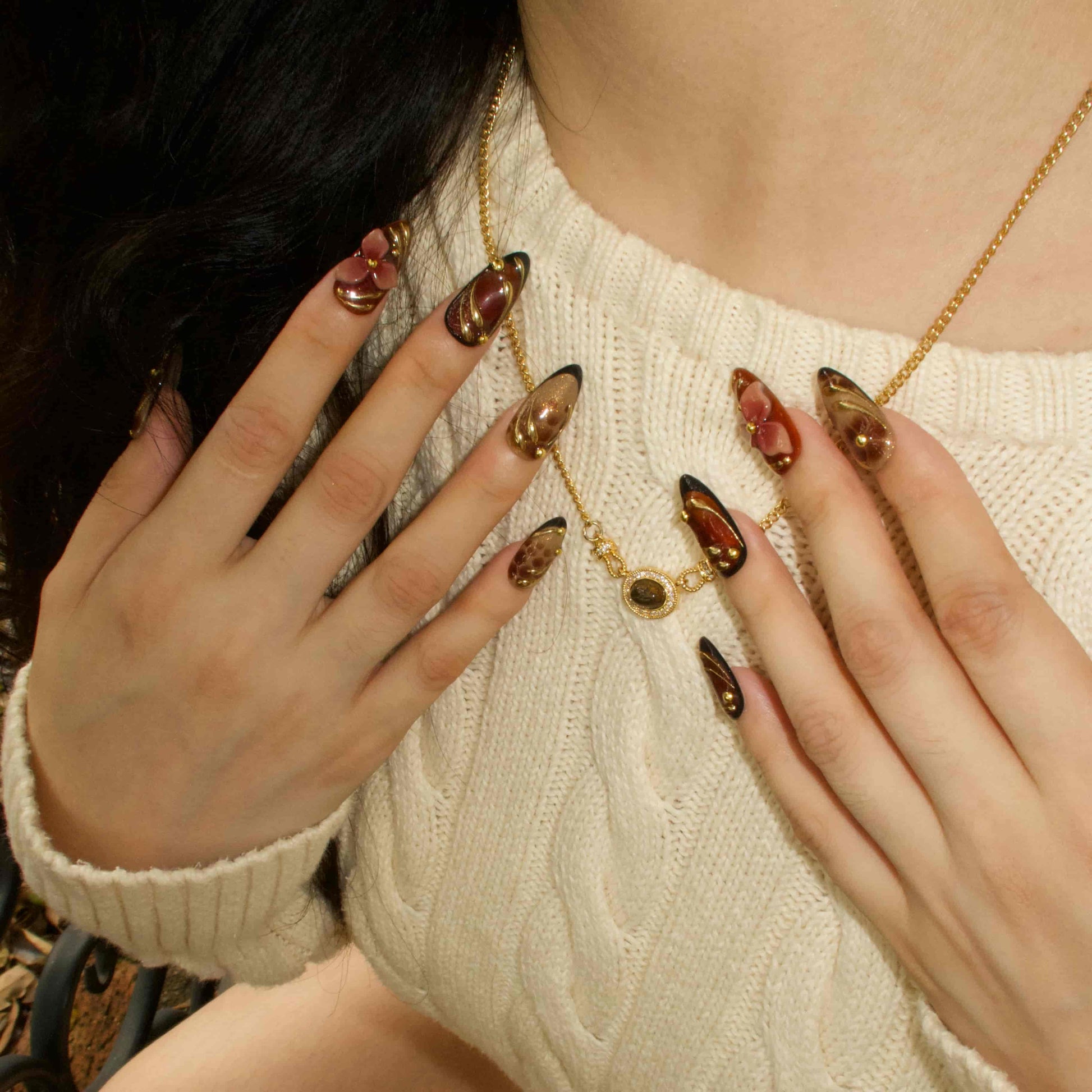 Add a touch of elegance with Amber Glaze. These beautiful press-on nails feature a rich brown base with classic French tips, soft gradient effects, 3D golden mermaid accents, and delicate 3D floral details. Effortless to apply, Ersa Nails Amber Glaze press-on nails transform your manicure into a chic and artistic statement.