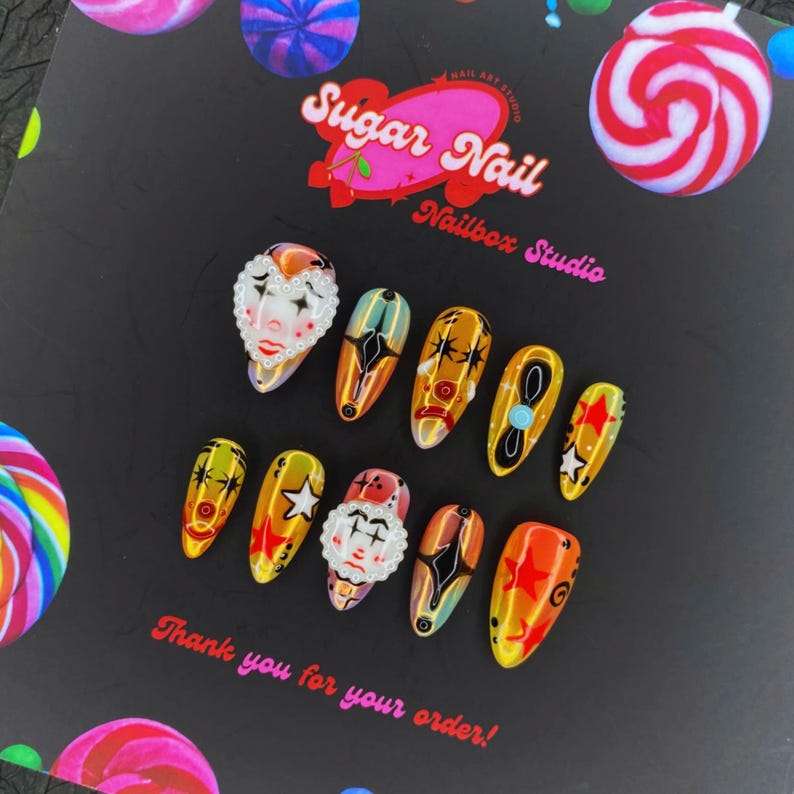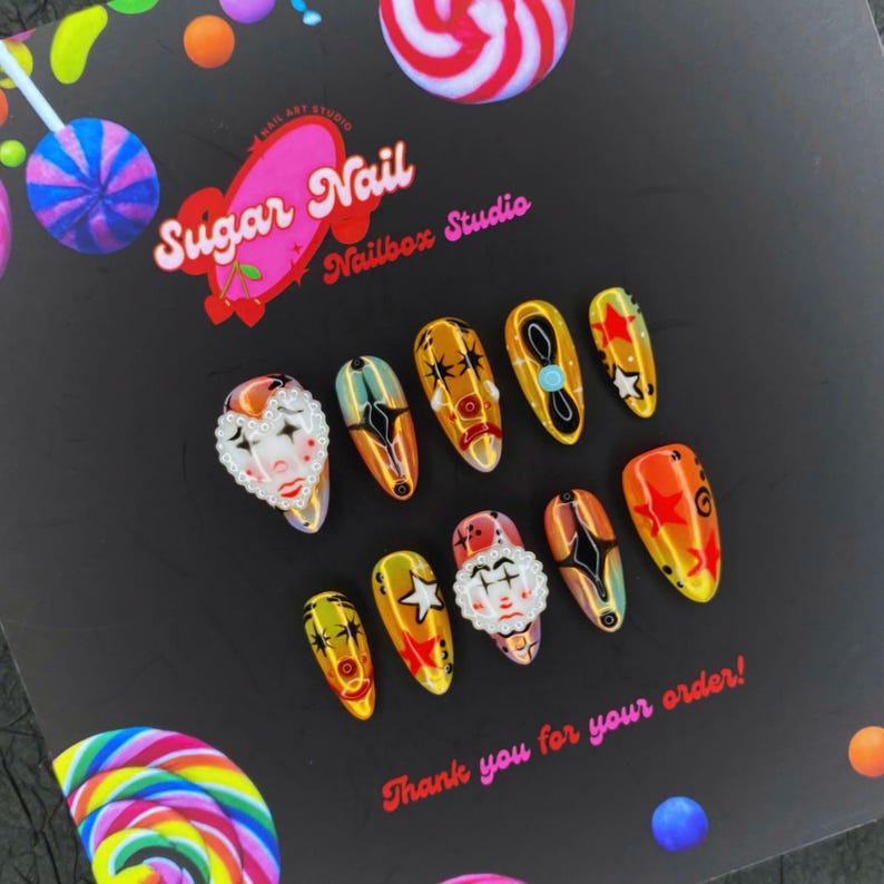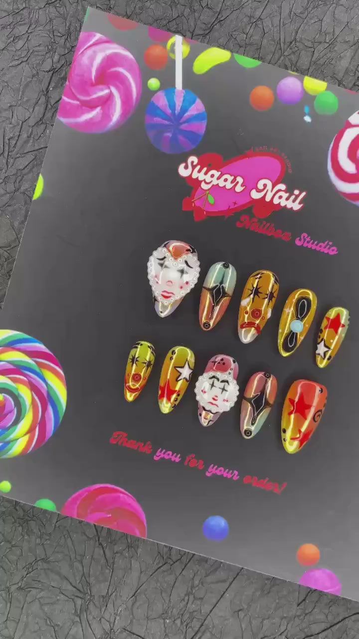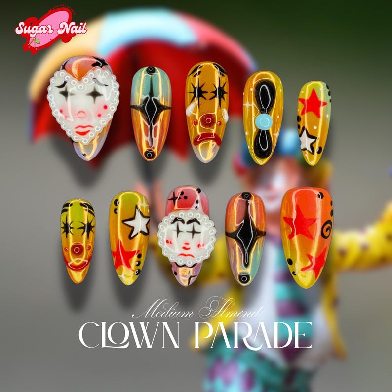 Artistic Clown Bold and Vibrant Carnival Press On Nails โ playful circus colors with a creative twist. Easy to apply, durable, and perfect for fun festival looks.