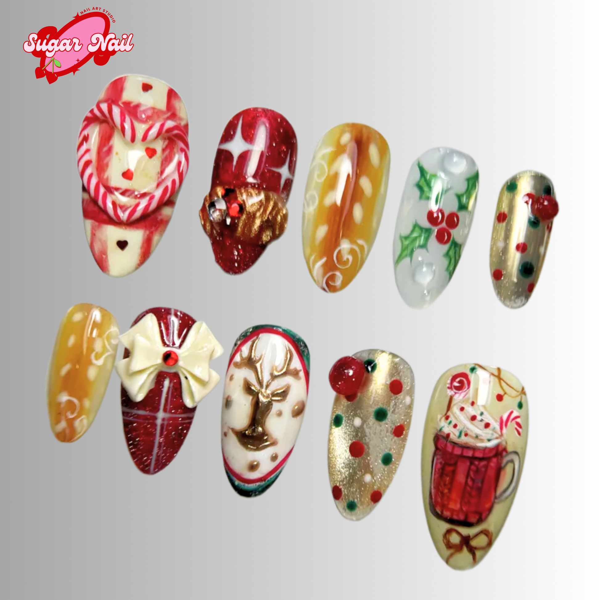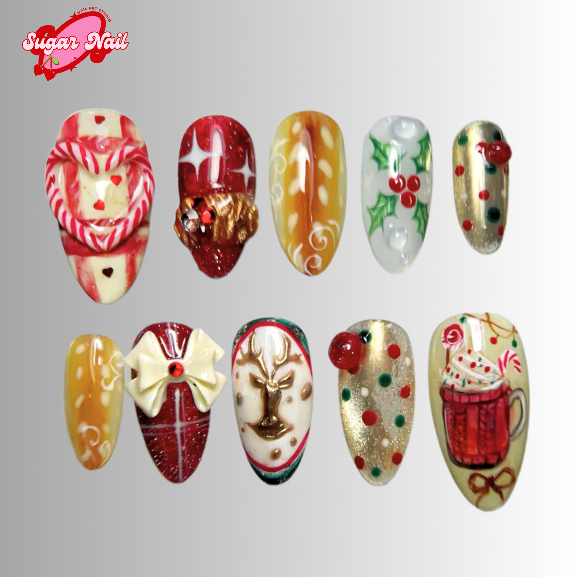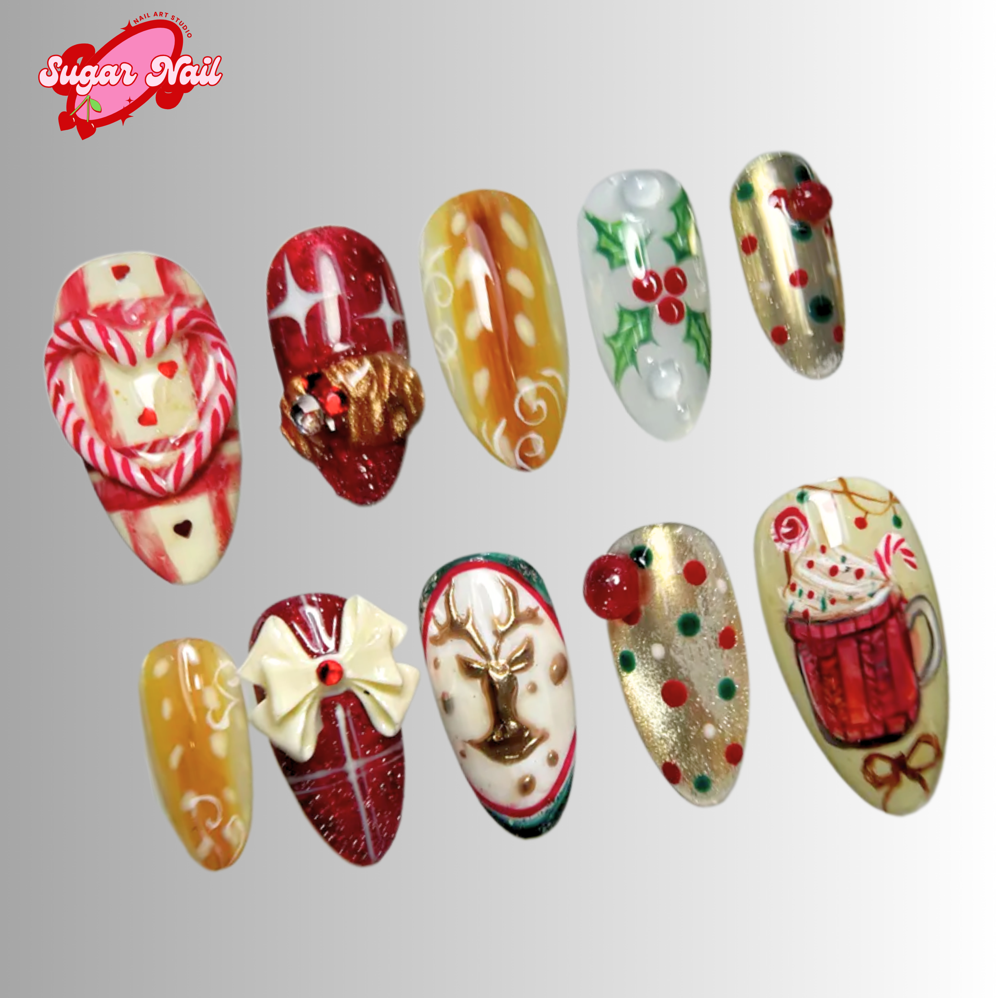 Each SugarNail set is crafted by hand using high-quality acrylic and gel, finished with a salon-grade glossy topcoat. Whether you're planning a holiday, prepping for a special event, or just want effortless beauty at home, our nails bring elegance and durability to your fingertips โ no appointment needed.