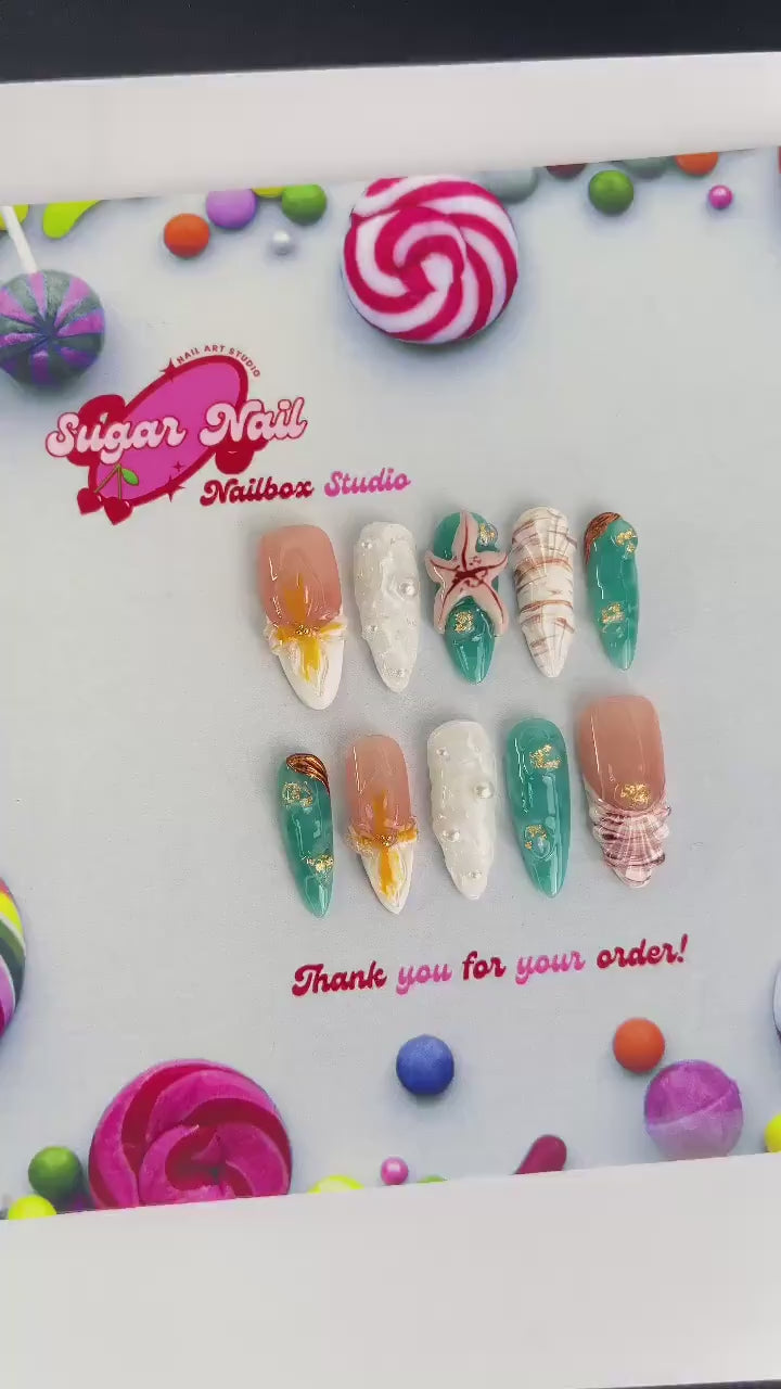 Elevate your manicure with luxury ocean-themed press-on nails! Inspired by dreamy seaside nail designs, this reusable nail set features handcrafted 3D flowers and starfish for a tropical, elegant look.