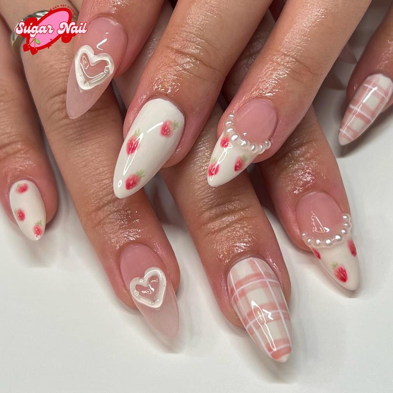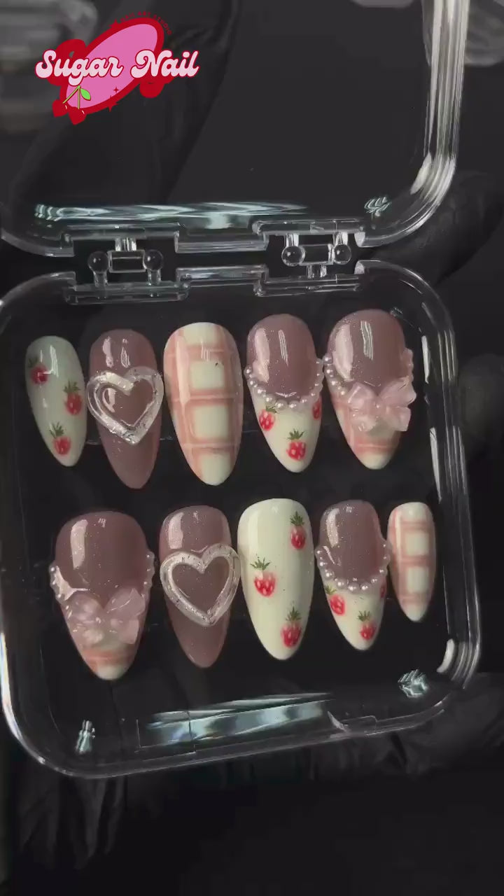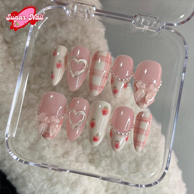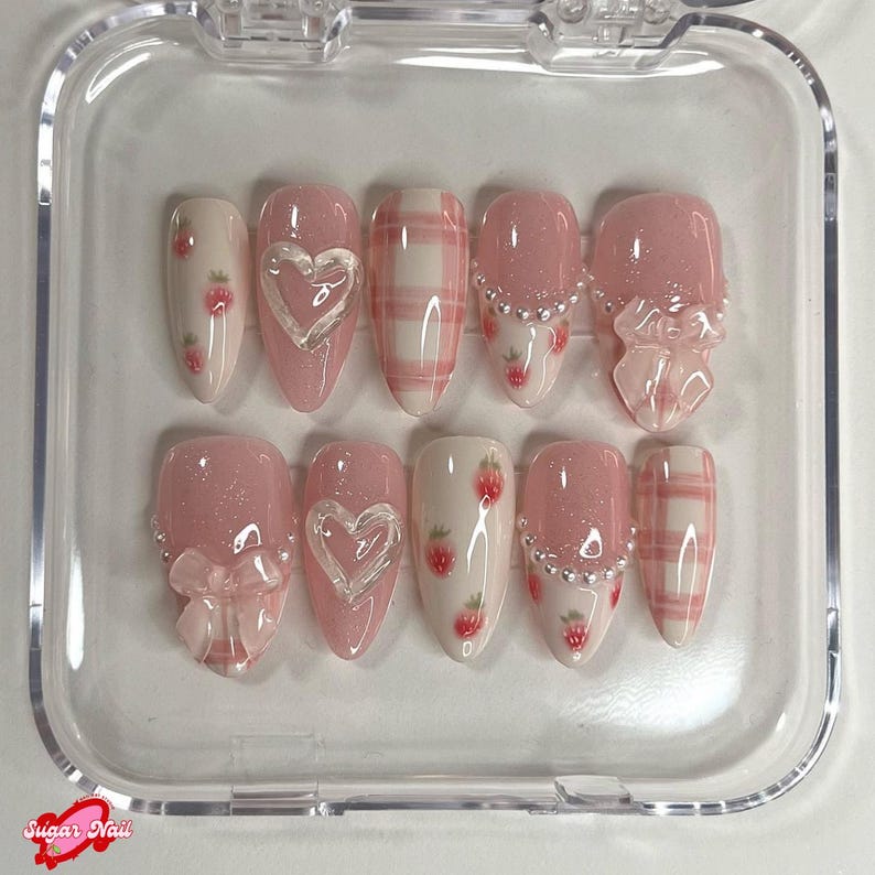 Indulge in cuteness overload with the Sweet Strawberry Plaid press-on nails! Featuring adorable hand-painted strawberries, soft pink plaid, 3D heart accents, and delicate pearl details, this set is perfect for a dreamy, cottagecore aesthetic.