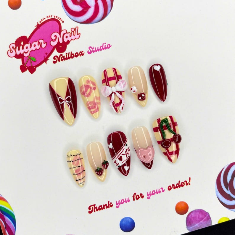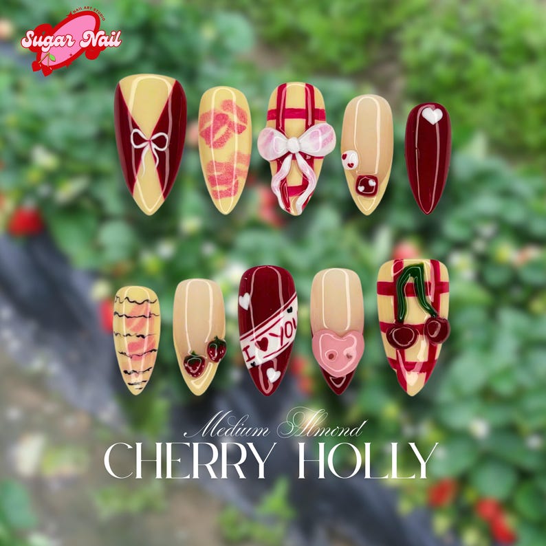 Celebrate the sweetness of cherries with Cherry Holly — a handcrafted press-on nail set inspired by juicy cherries and festive holly vibes. Featuring vibrant reds, fresh green accents, and charming cherry designs, this set creates a playful, eye-catching look perfect for summer fun, casual wear, or cheerful everyday style.