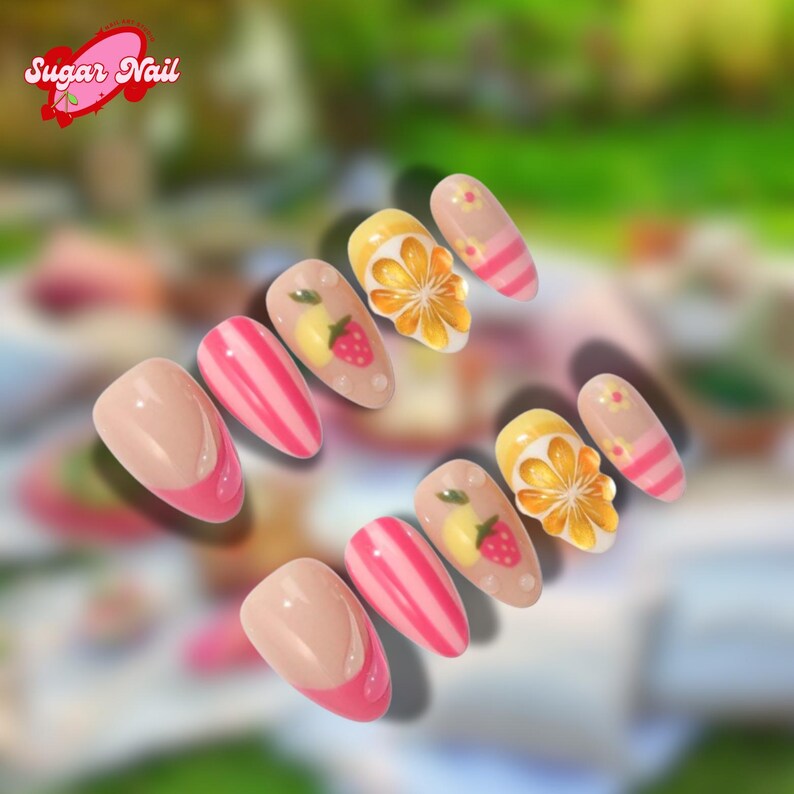Refresh your nails with a burst of summer sweetness with Citrus Breeze — a handcrafted press-on nail set inspired by juicy strawberries and zesty oranges. Featuring bright orange, soft red, and playful fruity accents, this set creates a lively, sun-kissed look perfect for warm days, beach outings, and cheerful everyday style.
