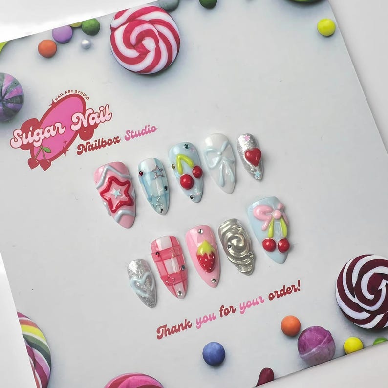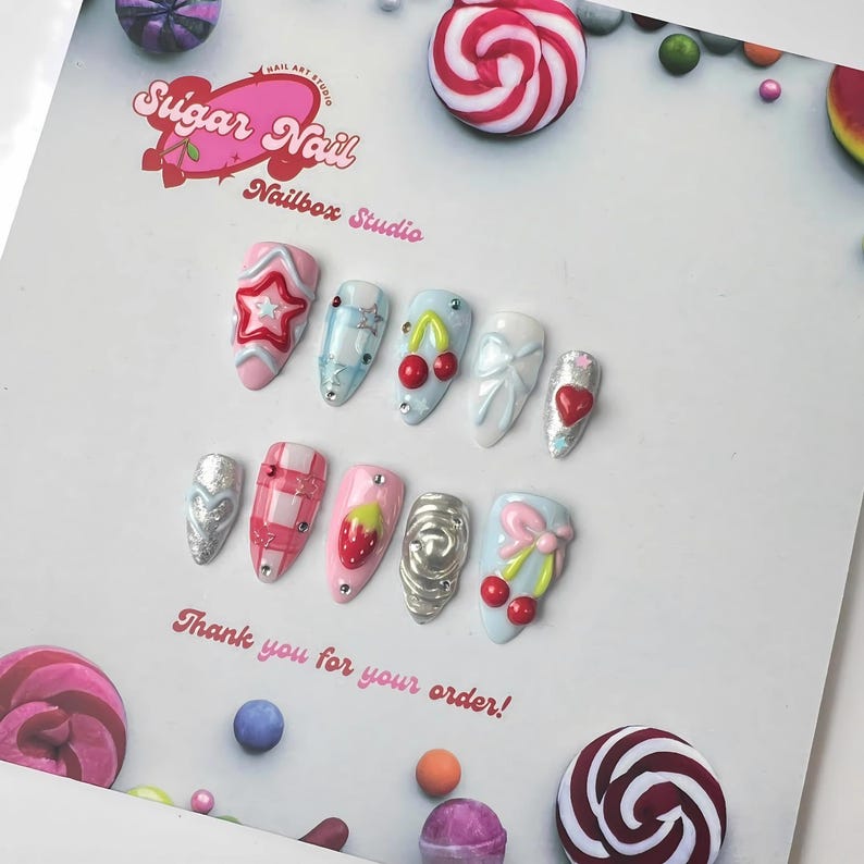 Each SugarNail set is crafted by hand using high-quality acrylic and gel, finished with a salon-grade glossy topcoat. Whether you're planning a holiday, prepping for a special event, or simply want effortless beauty at home, our nails bring elegance and durability to your fingertips — no appointment needed.