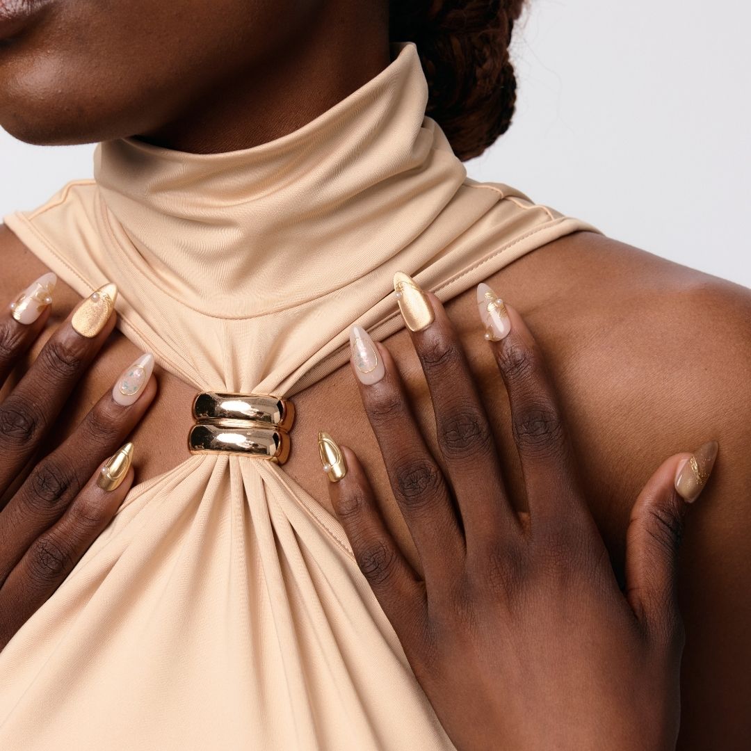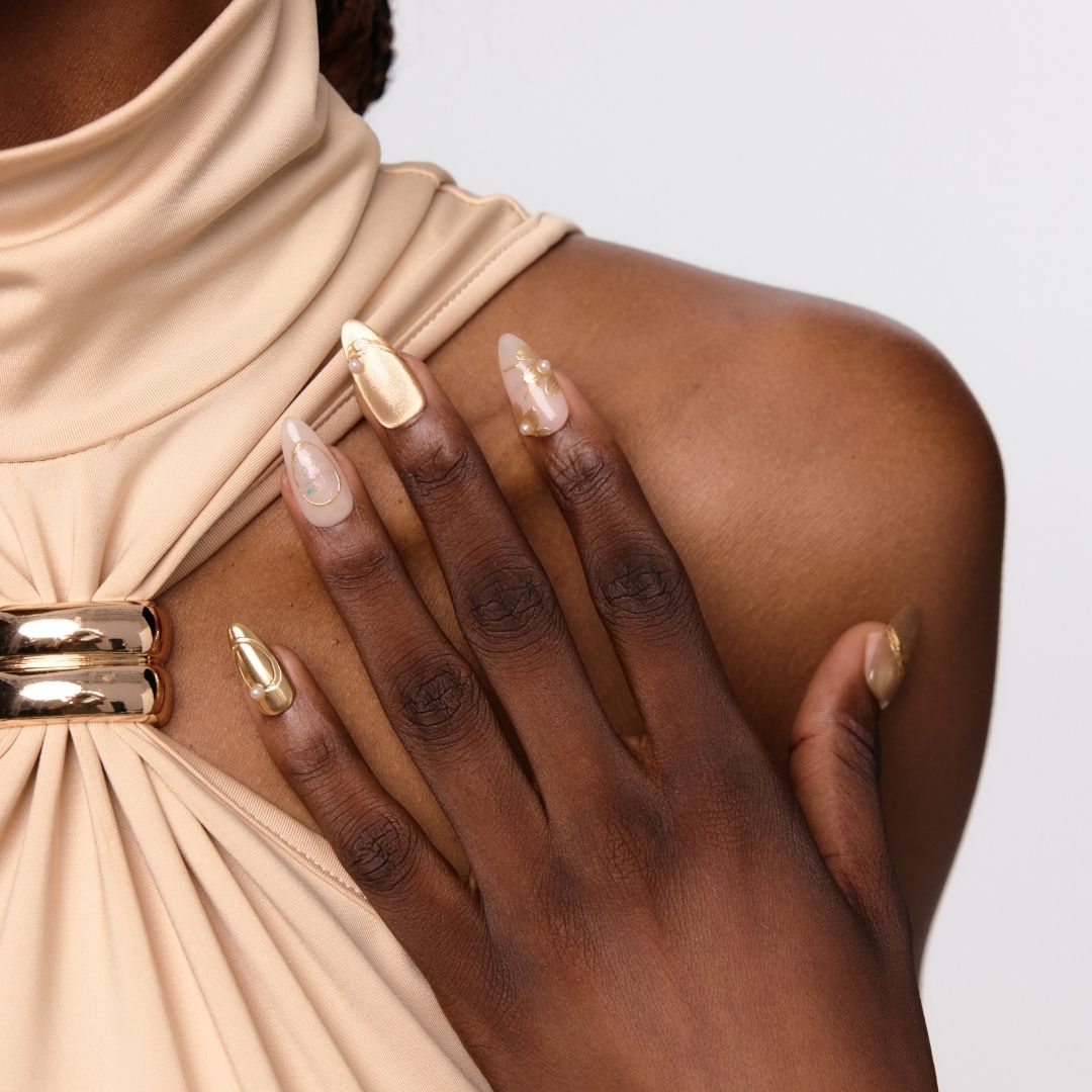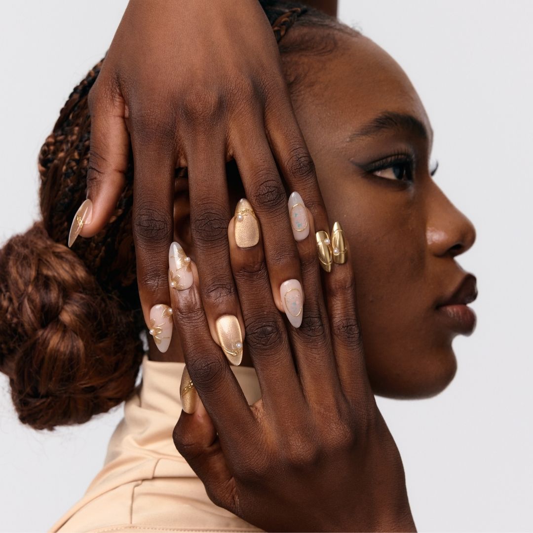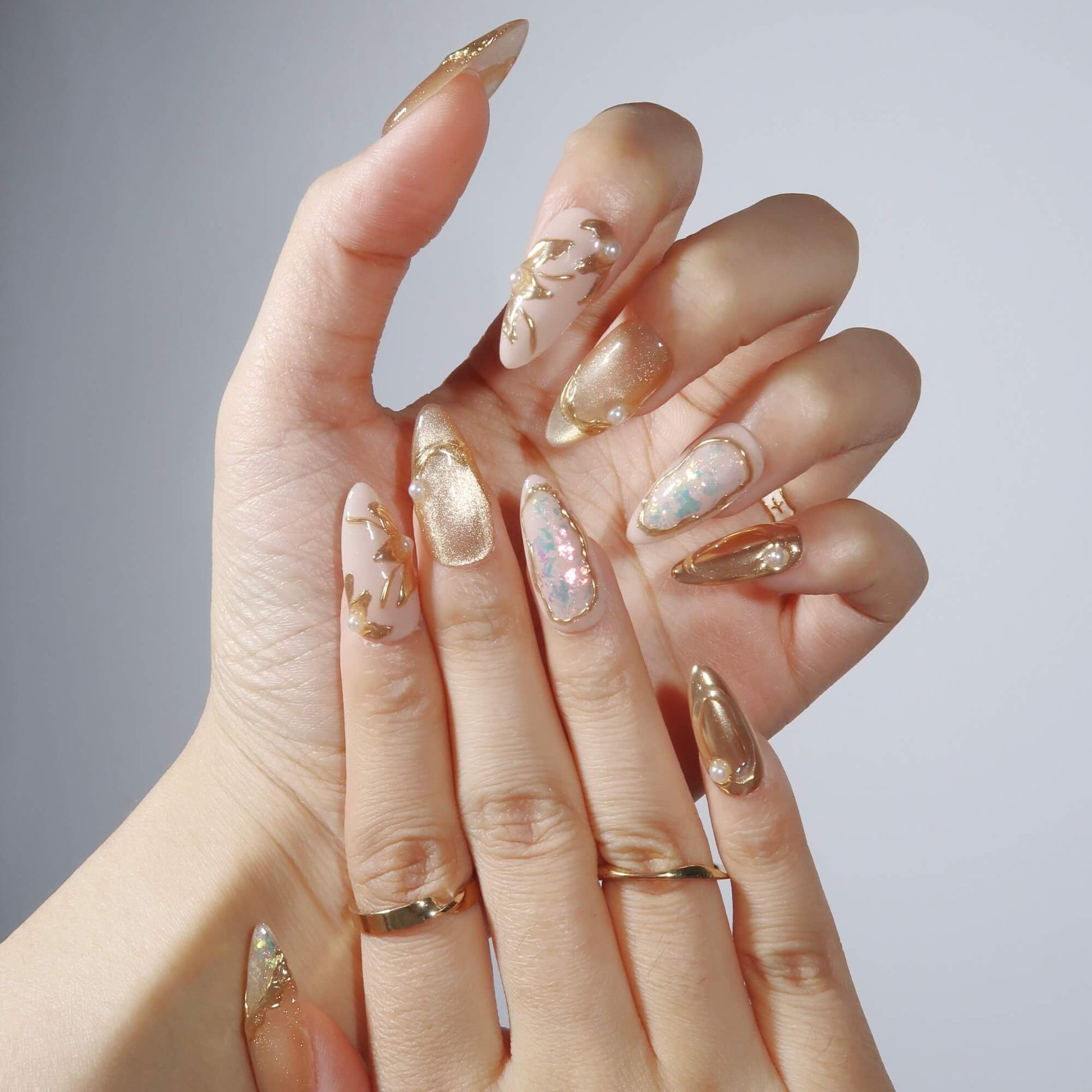 Step into the realm of opulence with Eldorado, where every detail whispers luxury. This dazzling set features a golden cat-eye base adorned with shimmering glitter and irregular gold lines that radiate brilliance. Pearls add a touch of elegance, while the petal-shaped design on the index finger creates a captivating focal point. Perfect for making a statement at special events or elevating your everyday glam, Eldorado is your ticket to a golden glow.