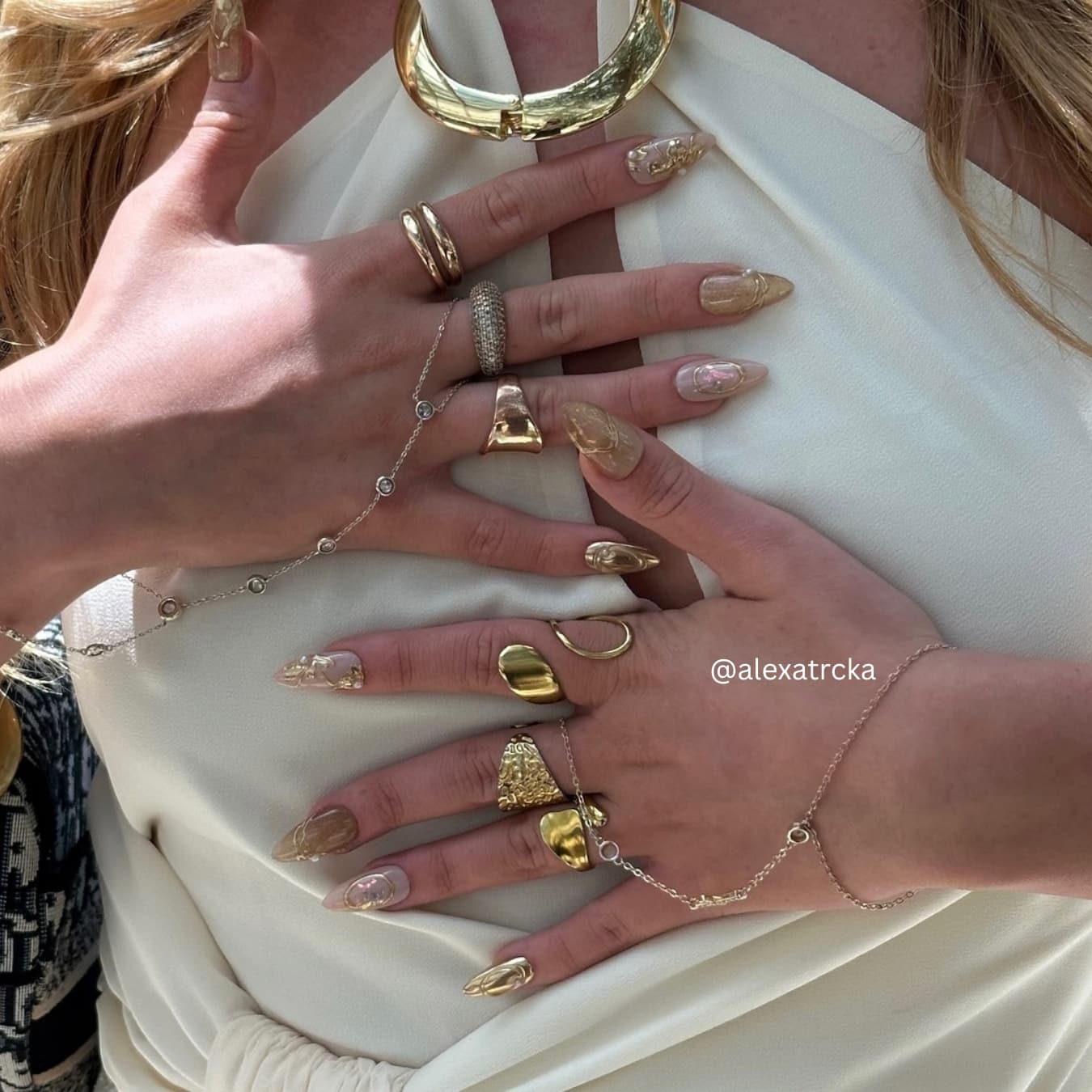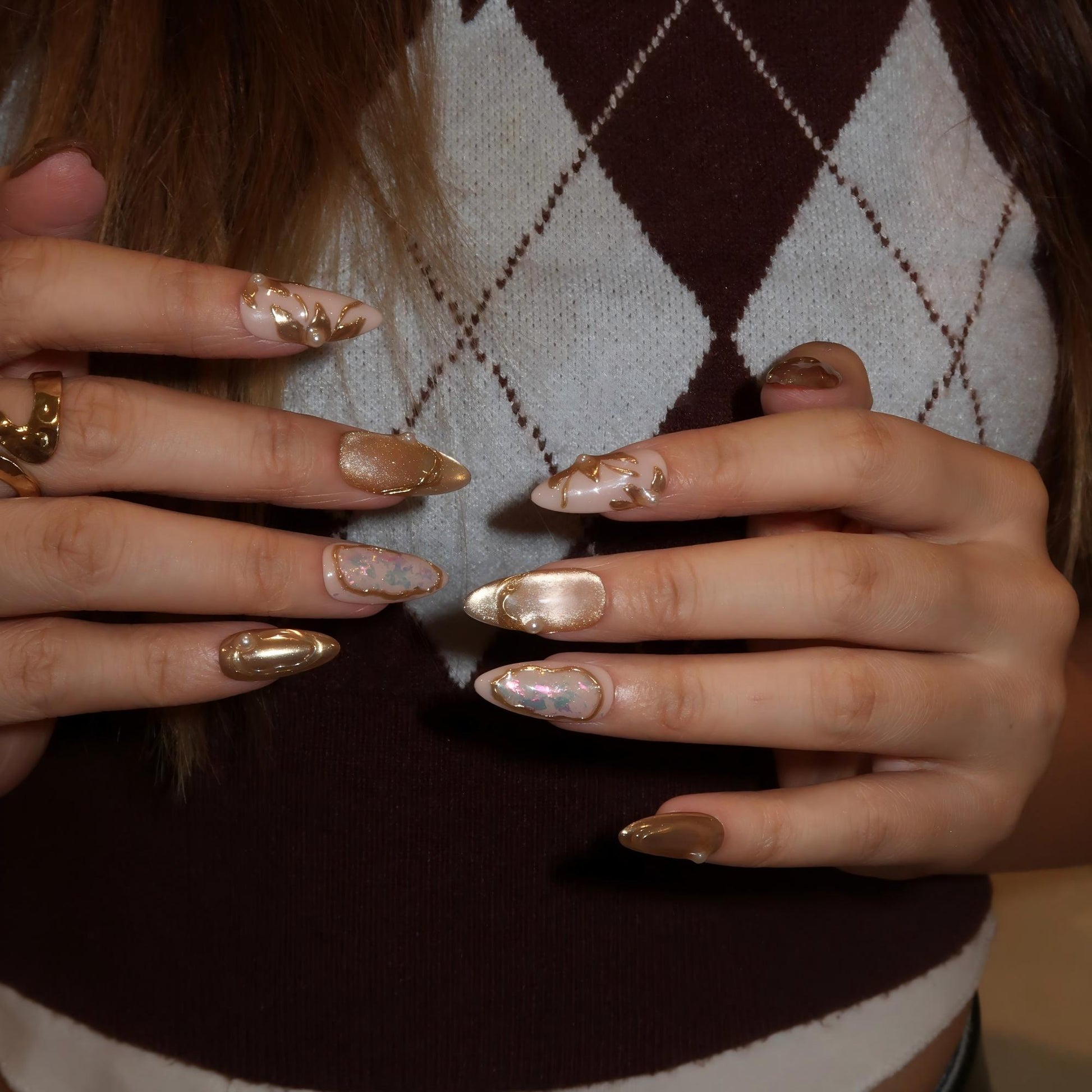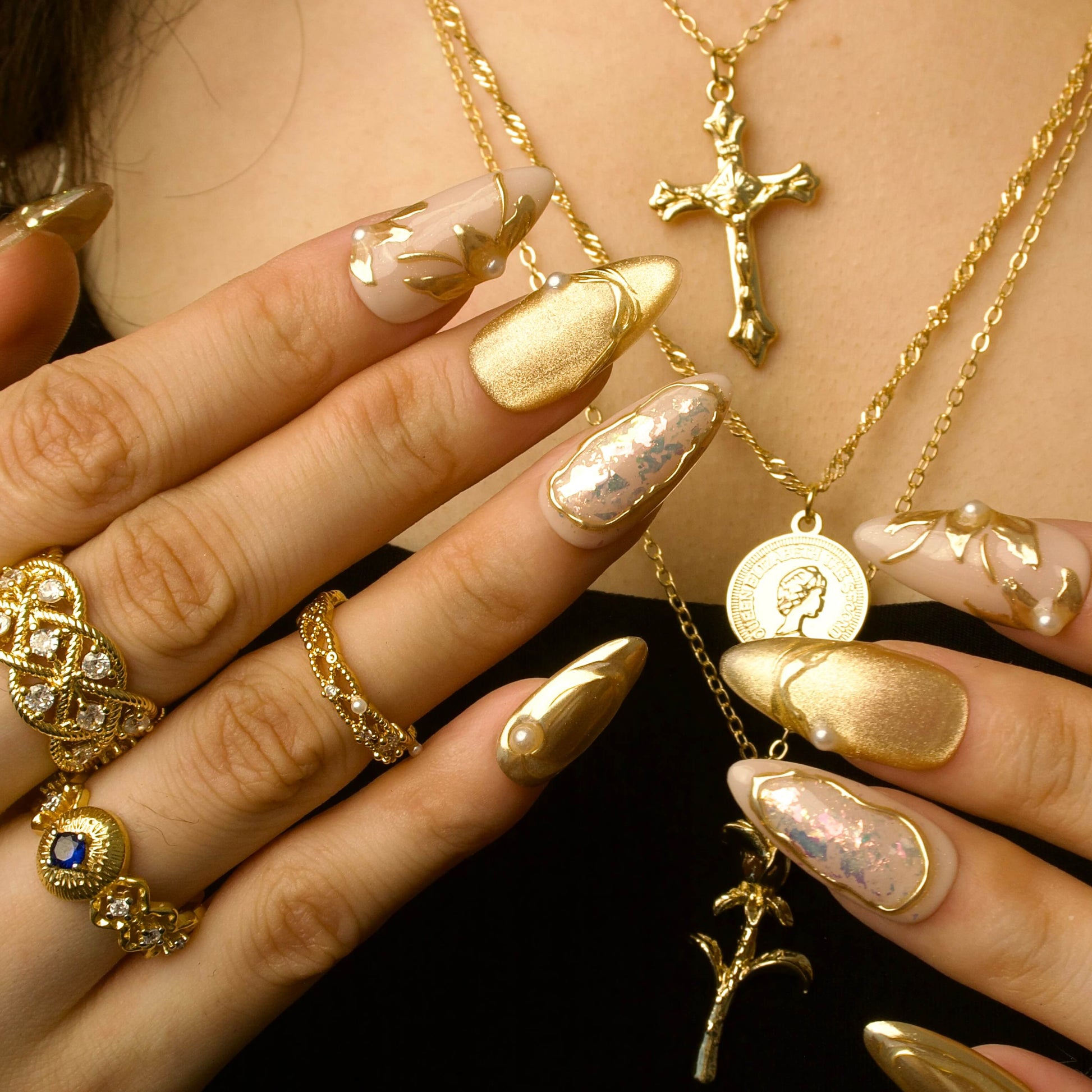 Step into the realm of opulence with Eldorado, where every detail whispers luxury. This dazzling set features a golden cat-eye base adorned with shimmering glitter and irregular gold lines that radiate brilliance. Pearls add a touch of elegance, while the petal-shaped design on the index finger creates a captivating focal point. Perfect for making a statement at special events or elevating your everyday glam, Eldorado is your ticket to a golden glow.